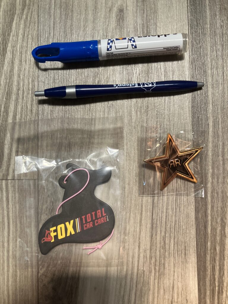 The display included the car – I could look inside but not get in which I really wanted to try but all I envision John shaking his head :-). 2 Game simulators that had largest crowd primarily kids enjoying the races. Pepsi booth with Soda, Gift Raffle and RR pin (see picture). Another give away booth with pens, sanitizer spray bottle and I won car air freshener. Finally, the food – hot dogs (always a go to for me unless there is a brat), hamburgers and slushies.
