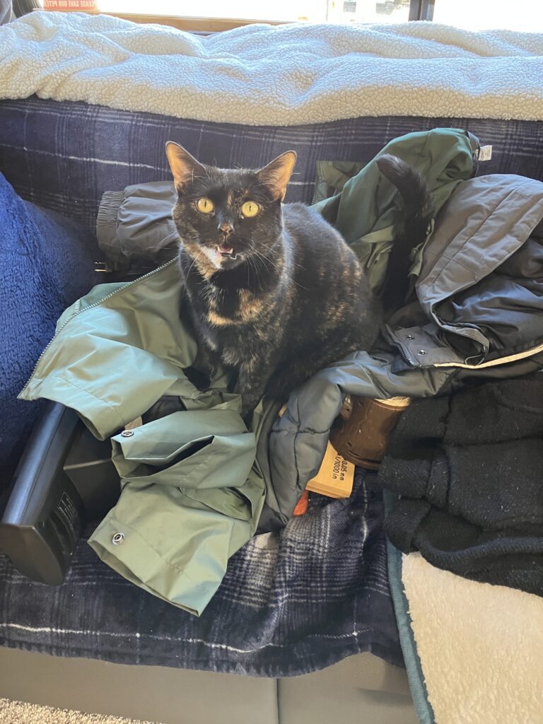 Cleo is a talker. Seeing her with mouth open is a common occurrence. Cat experts say that cats only talk to communicate with the owner not to other cats. Most likely she’s saying “pet me! pet me!”