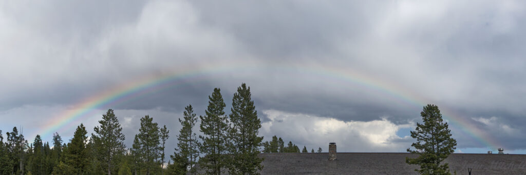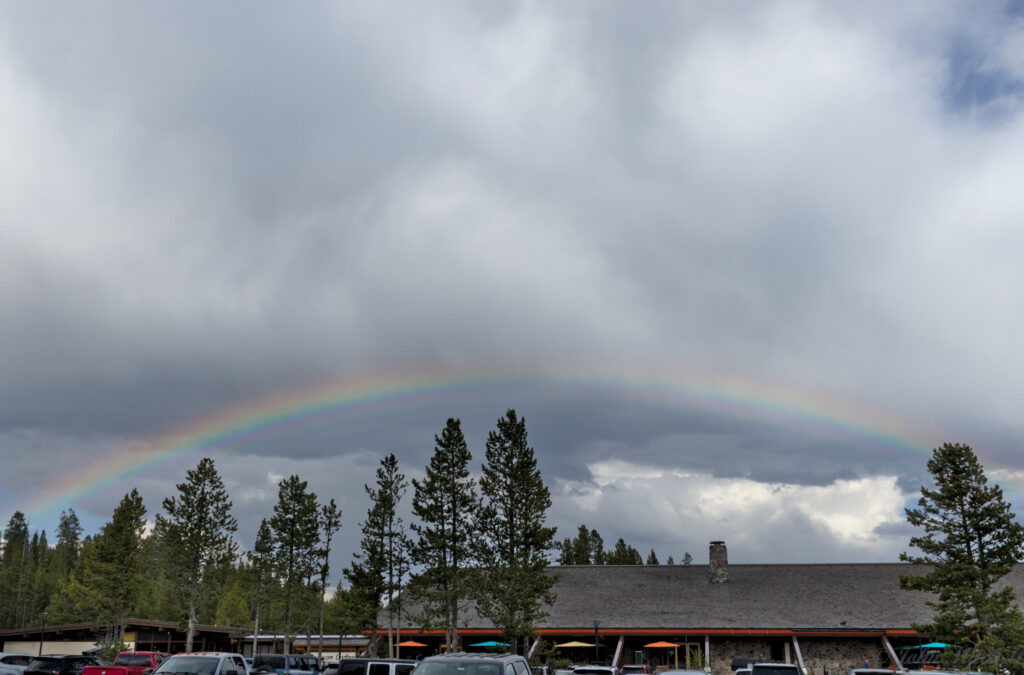 The Coyote was the only really interesting thing on the hike. We stopped by Canyon Village on the way home to visit the restroom. (It missed us. The texts it was sending were depressing. We needed to cheer it up.) On the drive out, a guy standing on the side of the road was pointing east towards a rainbow over the Canyon Lodge.