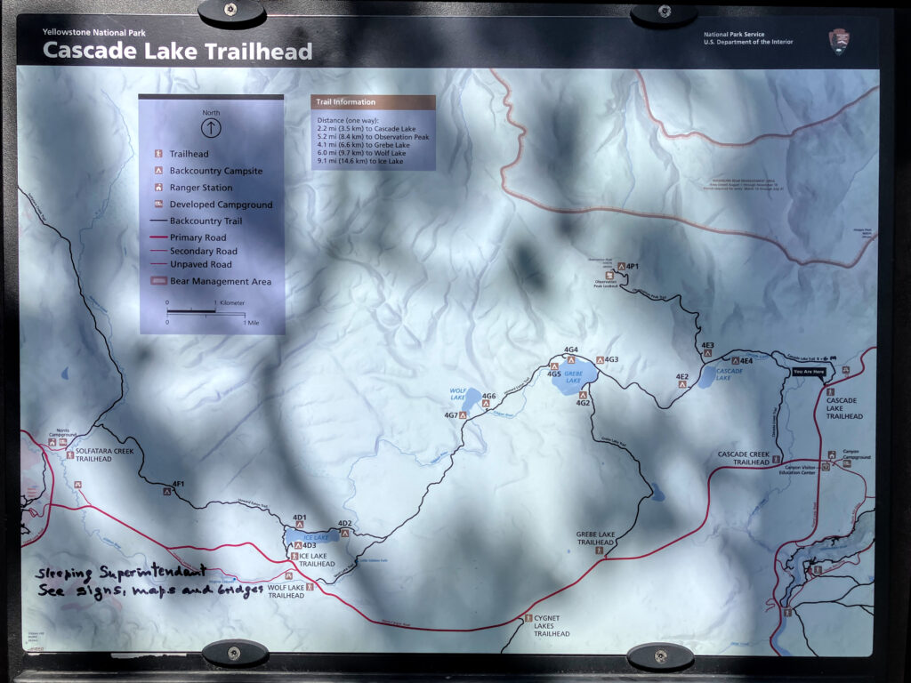 The plan was to hike Cascade Lake Trail to look for birds on Cascade Lake. There are supposed to be swans and grebes on this lake. We choose the trailhead off of Grand Loop Road/Dunraven Road because it was shorter and more scenic than the Norris-Canyon Road trailhead. The “shorter” trail being only about a 5 mile round trip.