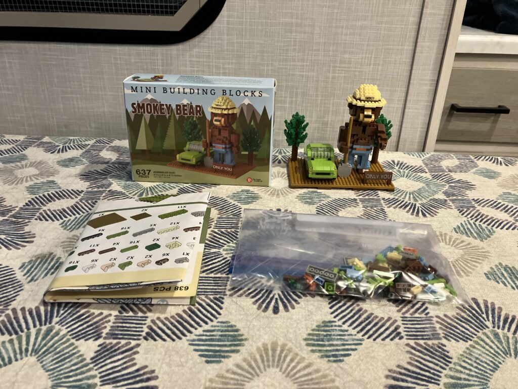 The building block kit is a knock off brand that is manufactured in China. John said the instructions are not as good as what you would find in a Lego Kit. Either way it was fun to put together. Most likely, we will continue to buy kits of animals found in the National Parks.