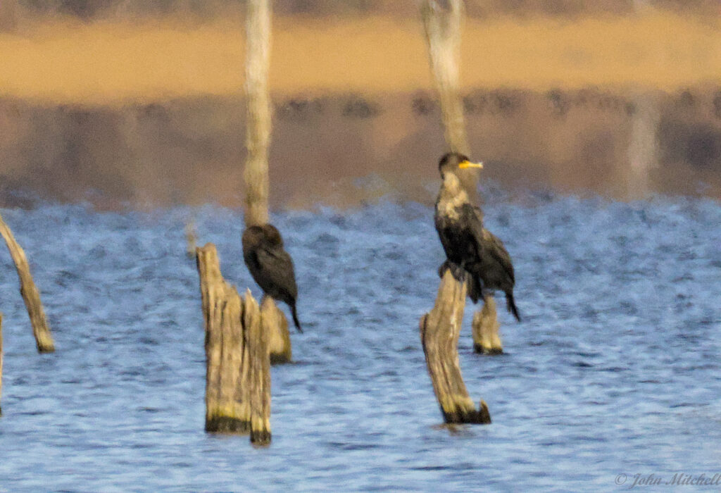 The phalacrocoracidae family includes cormorants and shags. The names were applied somewhat haphazardly based on the crests. They are medium to large seabirds with webbed toes and sharply hooked beaks. Many have colorful skin on their faces. They are fish eaters that range over most of the world.
