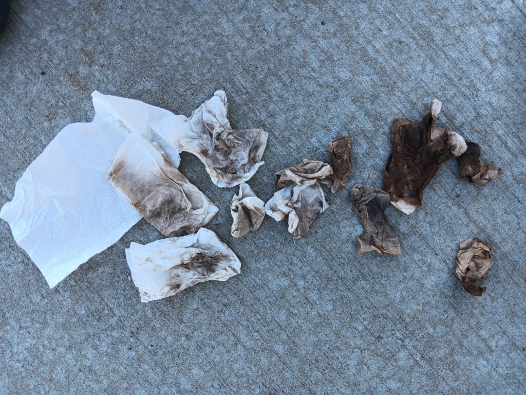 Step 3: Clean the sanded metal. You can see all the rust dust on the post sanding picture above. A little dawn dish detergent seems to work well for this. Paper towels are an easy wash rag because they can be thrown away. It might take 4 to 6 half paper towels to wash the axle, and another 4 to 6 to rinse it. Scrub down the axles a few times with the soapy water. The axle is probably still dirty.