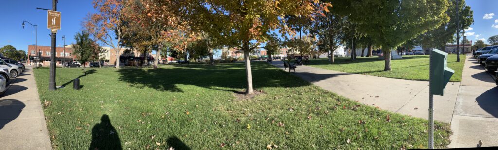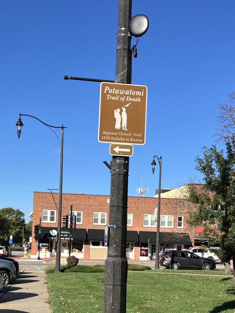Since it was just Halloween, John immediately noticed the sign “Potawatomi Trail of Death”. In 1838, the Potawatomi tribe was forced to leave Indiana and march 660 miles in 61 days to Kansas. Over 40 people (mostly kids) died during this march. When they arrived in Kansas, the next struggle was the major differences between Indiana and Kansas. Plants in Indiana did not grow or grow well in Kansas. Kansas did not have the same trees which made making housing difficult. The town has various signs throughout with trail information.