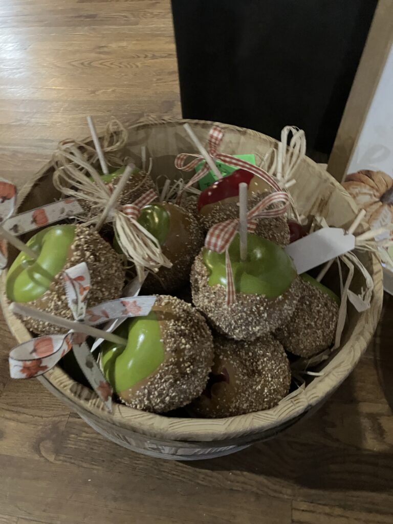 We have a friend in Ohio who is obsessed with Candy Apple & Co apples. She will buy 10 apples at a time to enjoy. Click the link to see the fancy apples they make: All Specialty Apples | Mysite. At the craft show we saw fake candy apples and thought of her.