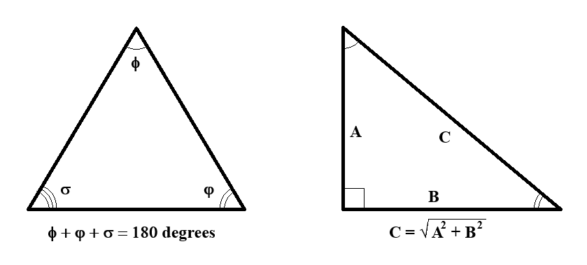 • The length of the hypotenuse (C) of a right triangle (one angle is 90 degrees) is the square root of the sum of the squares of the other two sides (A & B). This is the Pythagoras Theorem.