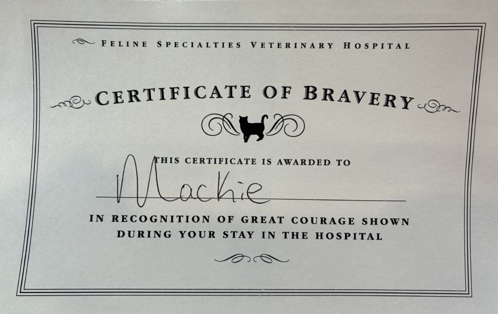 Mackie received a Certificate of Bravery for his vet visit. Along with before and after pictures of his teeth. The top 2 pictures are from before the cleaning, and the bottom 2 pictures are after the cleaning. You will notice another tooth missing. Fortunately, you only need one hand to count his remaining teeth.