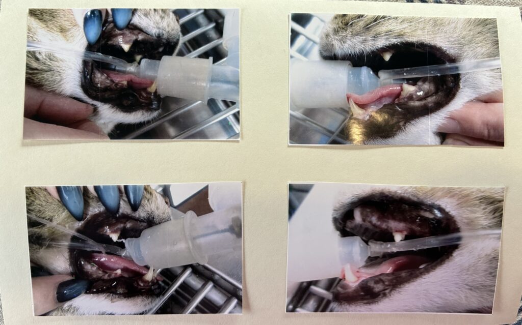 In case you are wondering about the cat teeth cleaning process, the cat is taken to the vet in the morning and dropped off. The vet will knock the cat out with some kind of drug, and then start the teeth cleaning process. Because Mackie is old with kidney issues, Mackie also received fluids to flush the drugs out of his system.