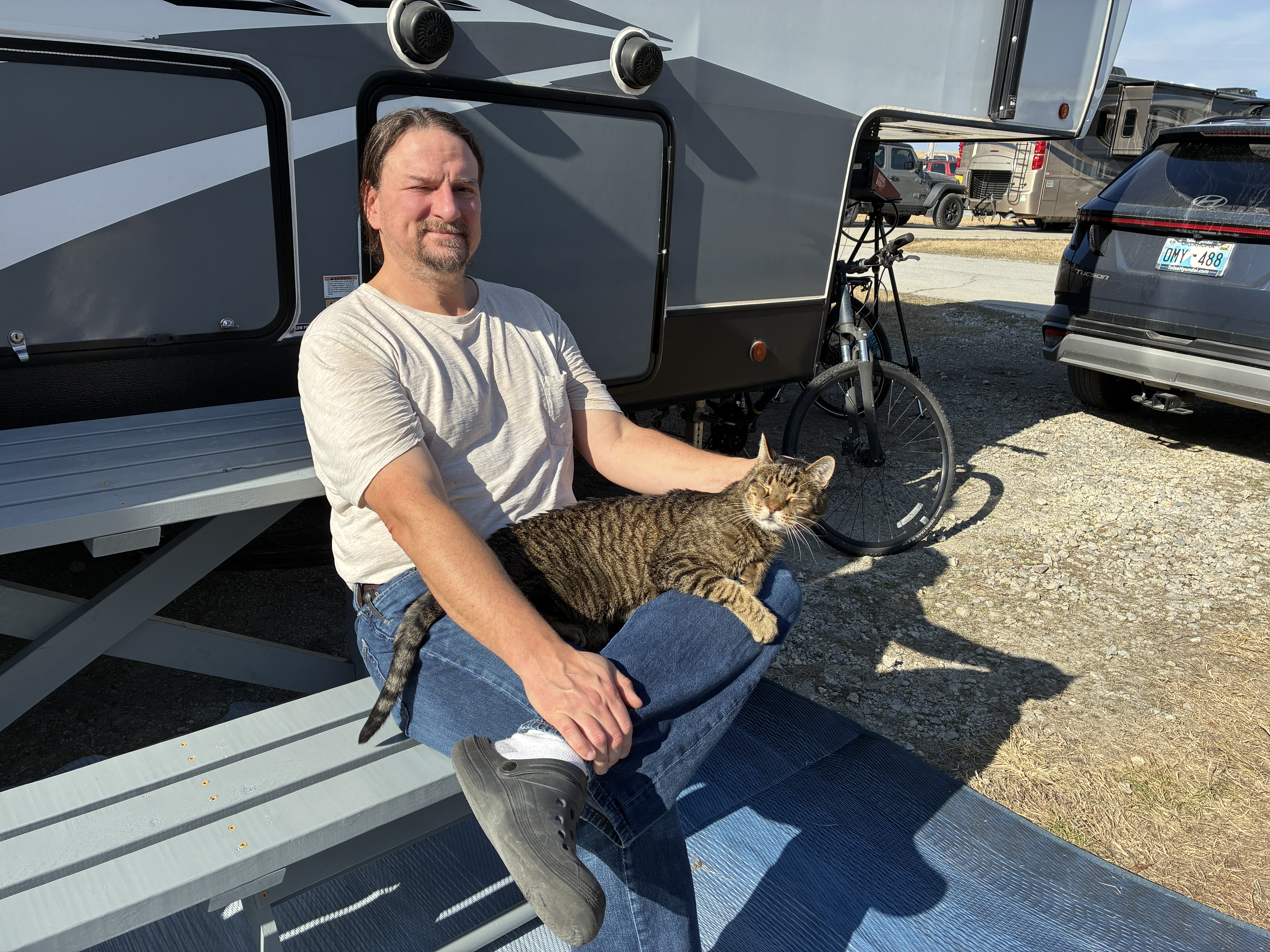 Mackie is not allowed to go roaming the neighborhood. I think he is just about as happy laying on John’s lap, sniffing the air, and being scratched.