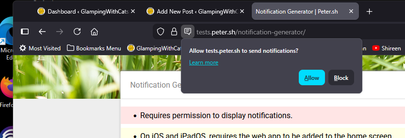 The request for permission looks something like the image below on a Firefox browser. Edge and Chrome will have something similar, but it probably will not be identical. Unless you know what you are doing, you should select block.