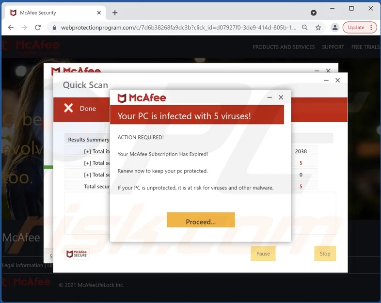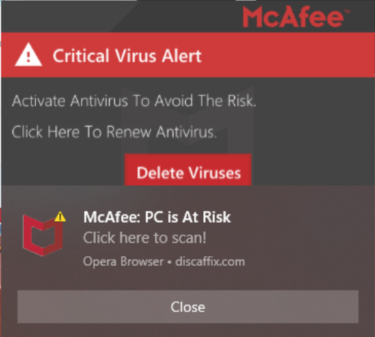 This image looks like a McAfee Virus Scanning popup warning you that viruses were found, but if you look closely, you will notice a few things.