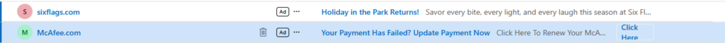 Why would a McAfee Ad be “Your Payment Has Failed?” instead of “World’s Most Installed Security Software!”? It would not be surprising to find that the Ad links to a “McAfee” scam website that “checks” your subscription payment, lets you know it “failed”, and offers to let you “renew” right then and there. So “helpful”!