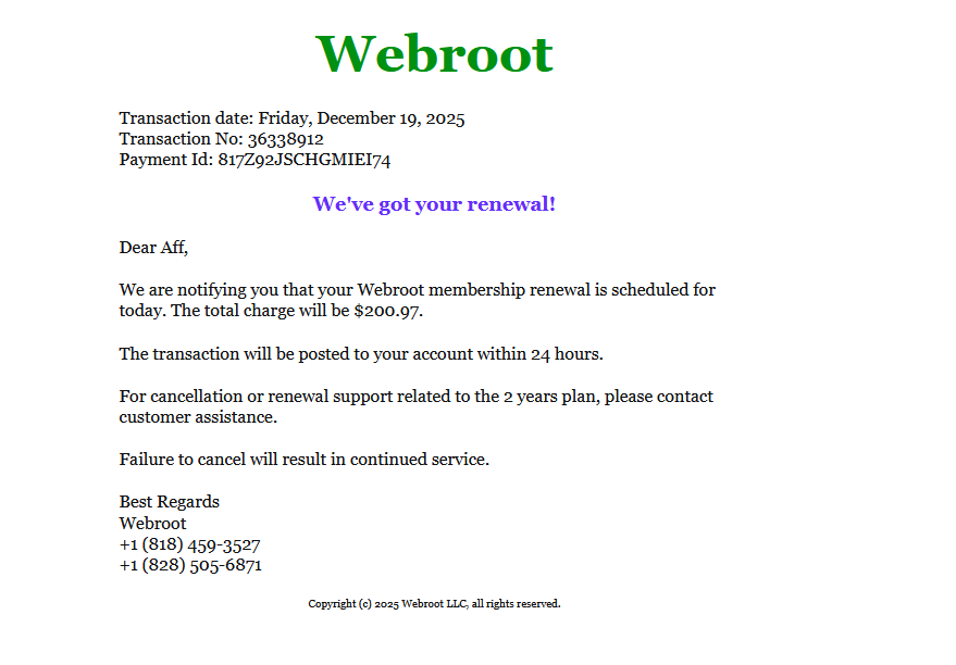 This is a well formatted, but blandly branded email from “Webroot”. You can see that the phone numbers do not match the website phone number.