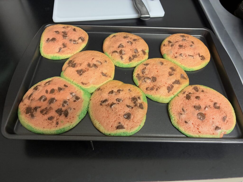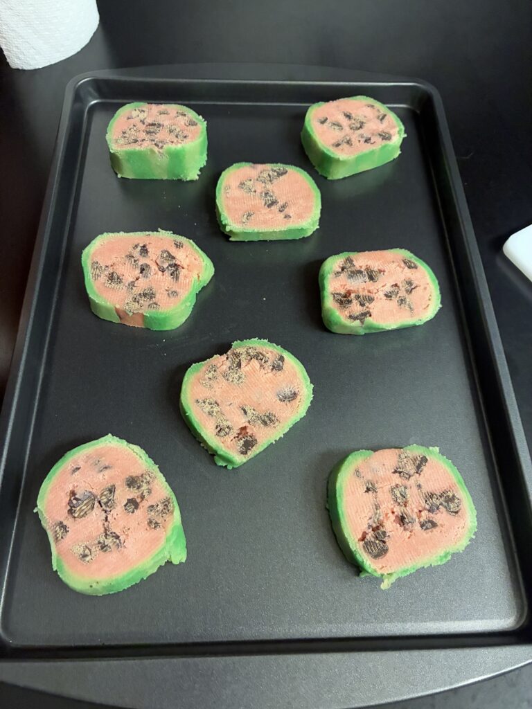 The Great British Bake Off had slice and bake cookies with intricate designs as the signature challenge for episode 2. Most contestants used a shortbread cookie, which is not our favorite, so we opted for chocolate chip cookies. The good news is that the cookies are not watermelon chocolate chip flavored; we just needed a design that justified having dark bits inside. A watermelon design met the requirement for dark seeds in the middle, but it probably does not classify as intricate.