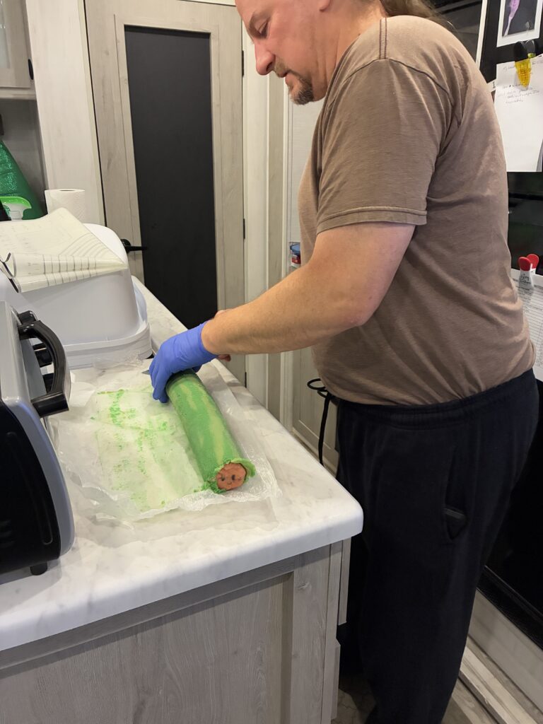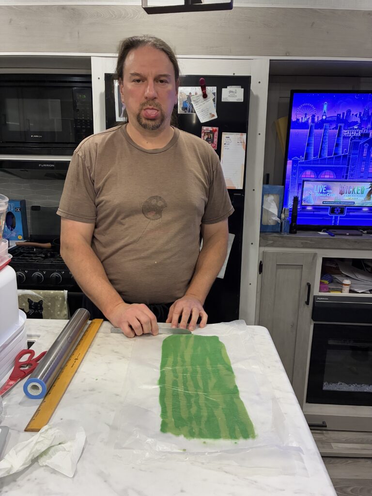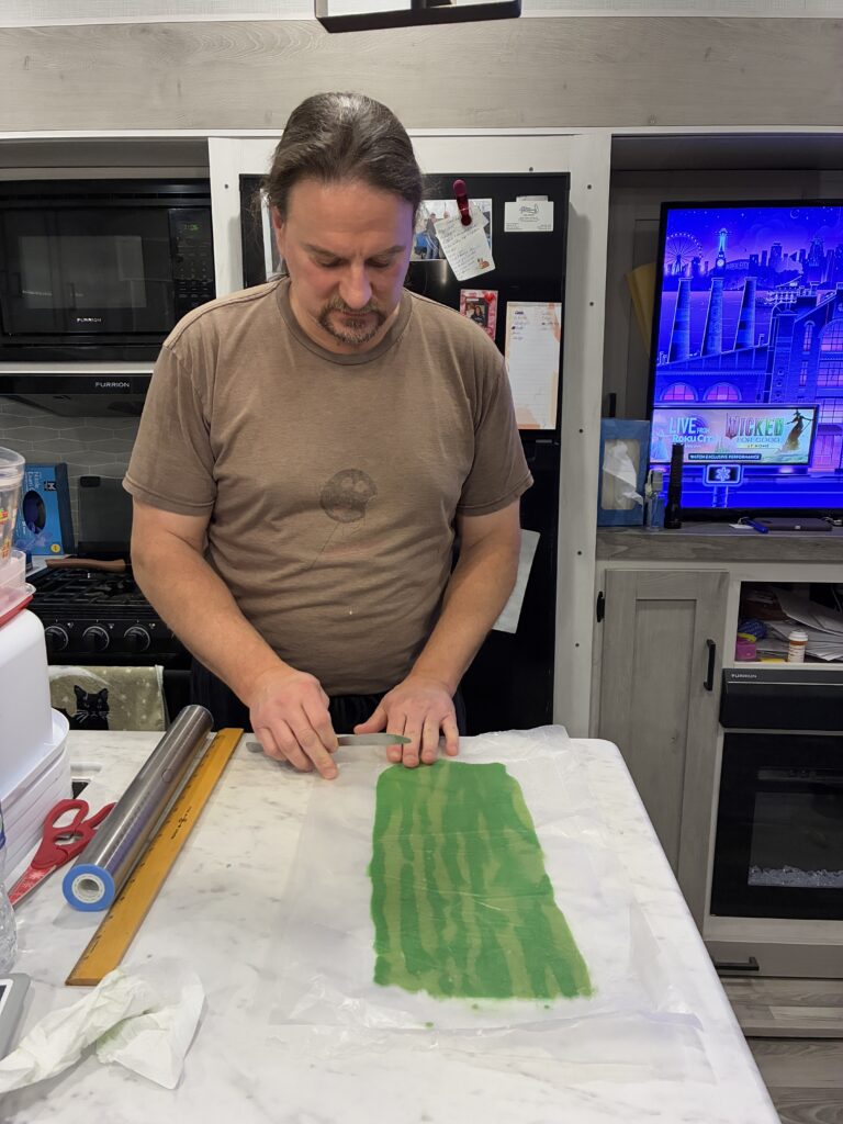 5. Roll out the uncolored rind dough into a 14 inch long by 6 inch wide rectangle. Roll out each of the dark and light green rind dough into 14 inch long by 3 inch wide rectangles. Freeze all three of them.