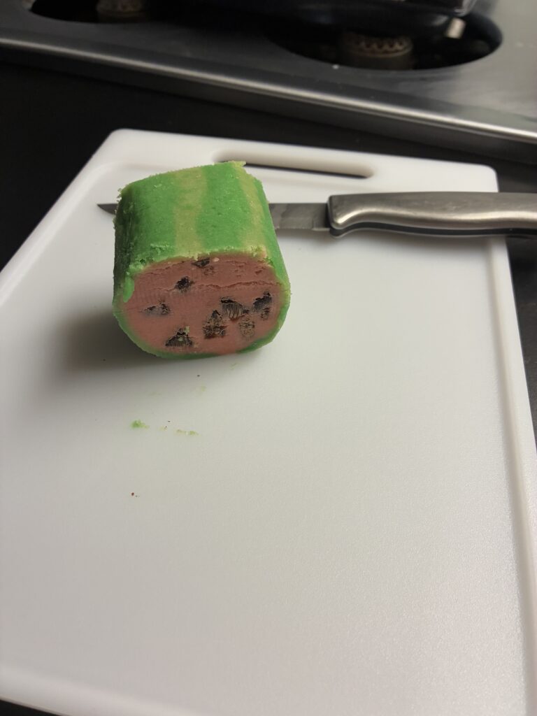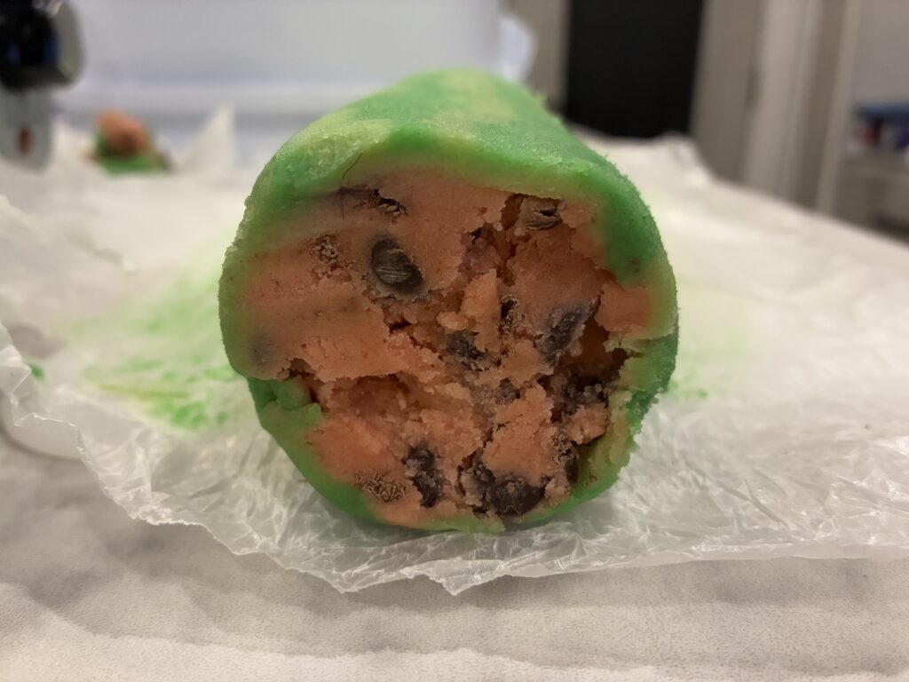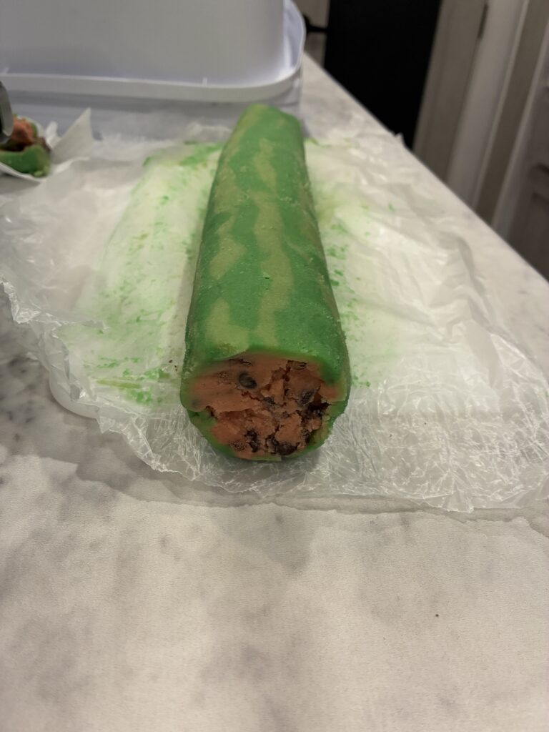 6. Cut the light and dark green rind into strips, alternate the colors, roll the dough into a 6.5 inch by 14 inch rectangle, and freeze. (Note: This does not work very well with chocolate chip cookies dough. It might work better with more rind dough, or it might be better to alternate the dough before freezing. It would probably work better to use a thin flat piping tip and pipe the soft batter into stripes before refrigerating and freezing.)