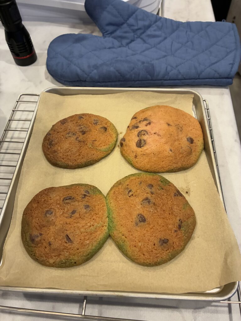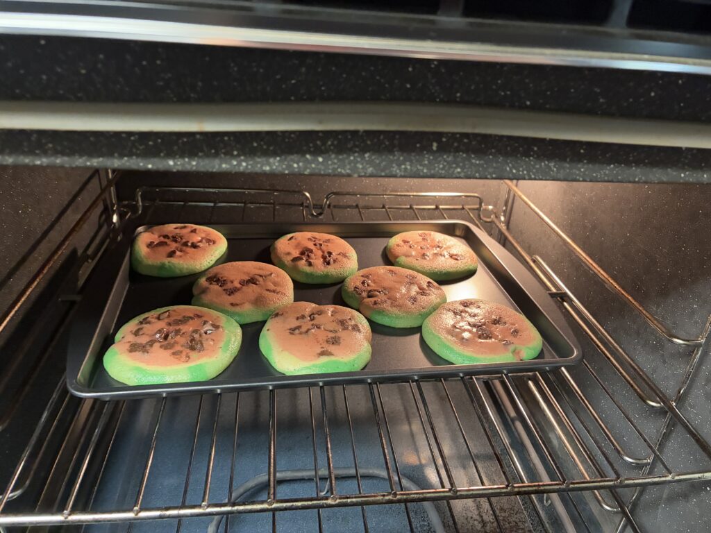 This batch looked good and tasted good. We think starting from a frozen cookie log and using a full sized oven both helped to make them turn out better.