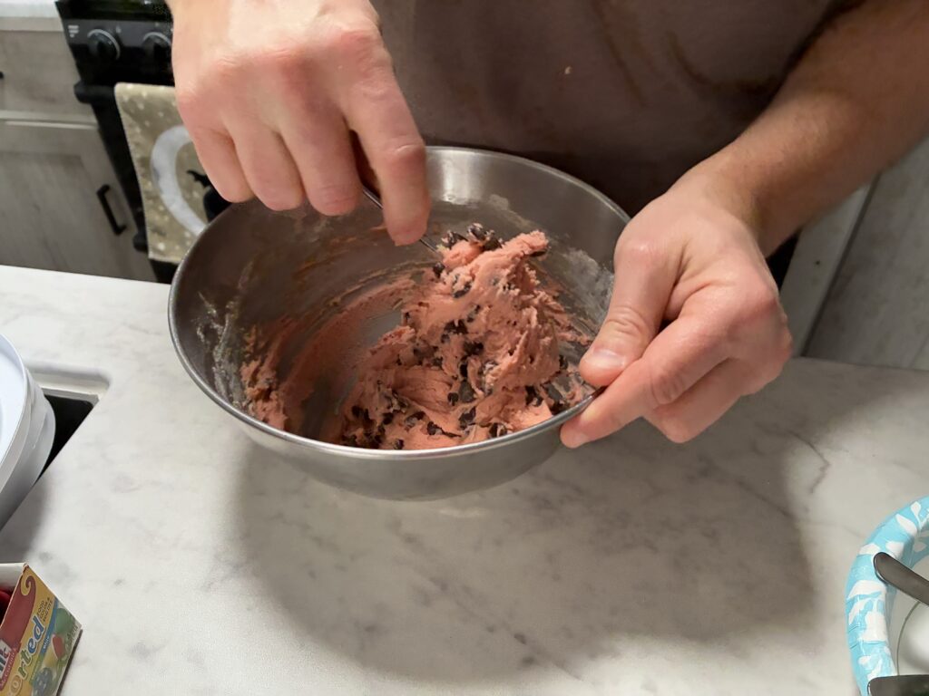 3. Mix the chocolate chips into the pink portion. We used 75% of the required chocolate chips because the pink part is only 70% of the cookie batter volume.