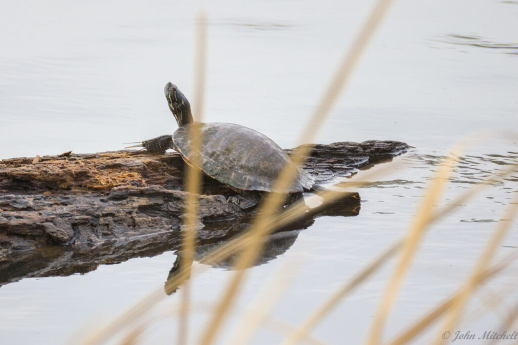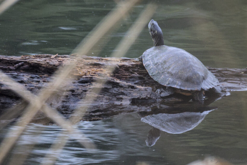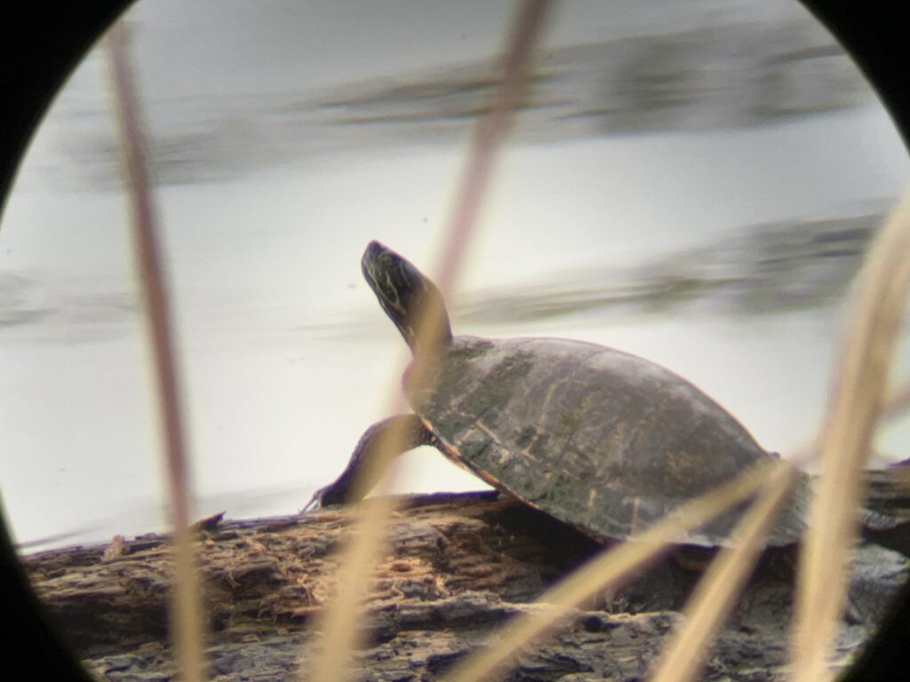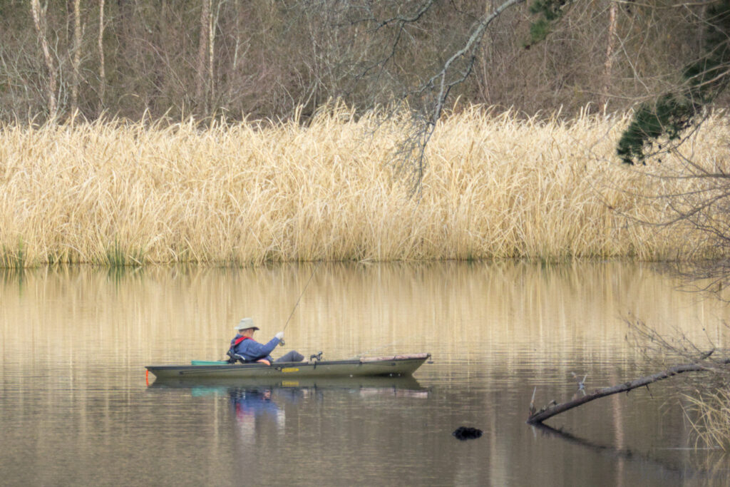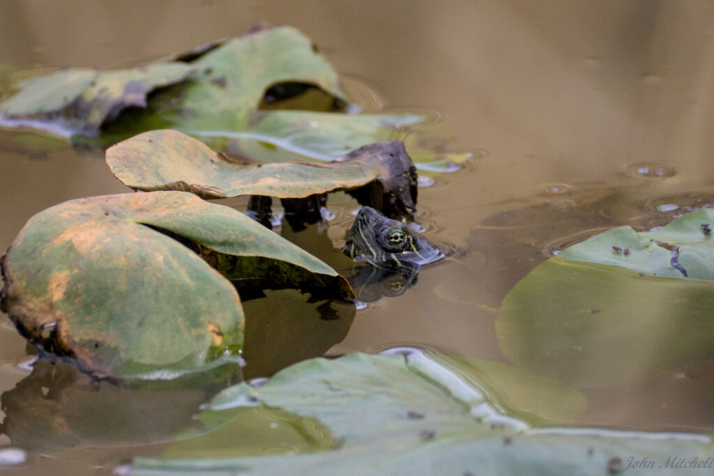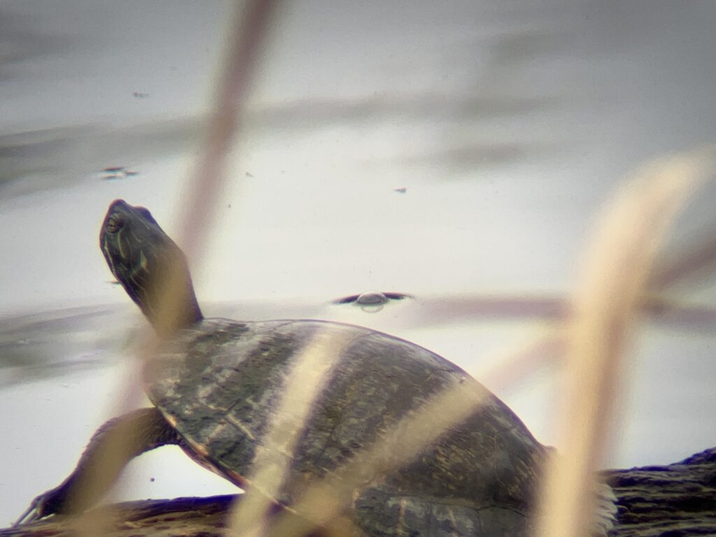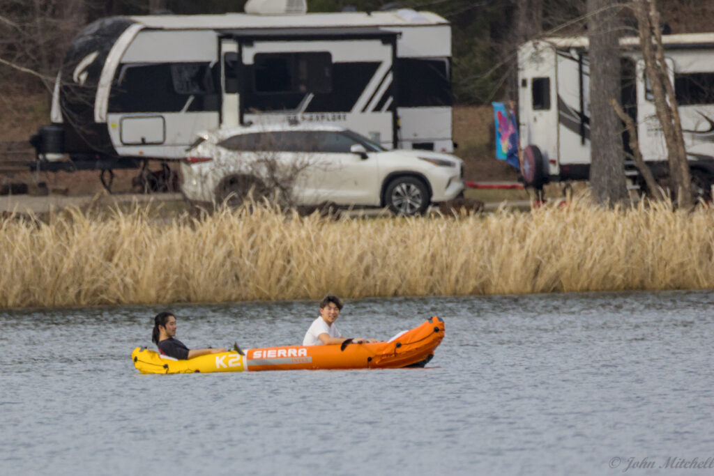 After seeing all the turtles on the first hike with only cellphone for pictures, we went looking for the turtles again to get better pictures. Since John was carrying camera gear, we decided to drive. At the floating fishing pier, we looked for the grebes, but there were three fishermen on the pier. They were bouncing the pier so much that we could hardly use our gear. It John 5 minutes to get two passable pictures of the kayaking kids. There were no grebes today.