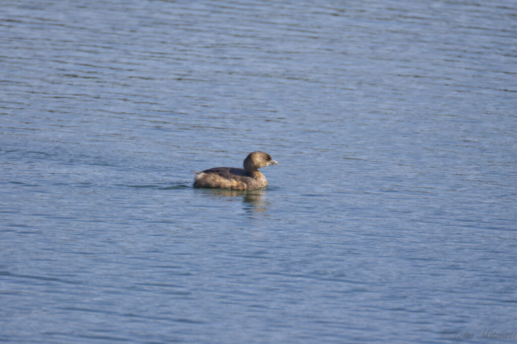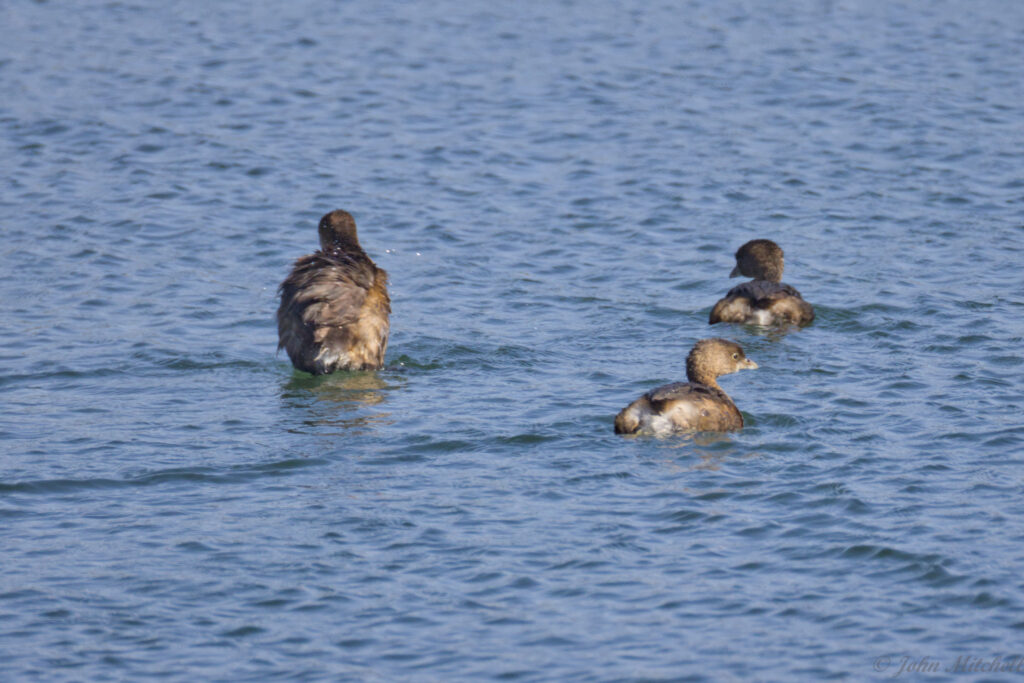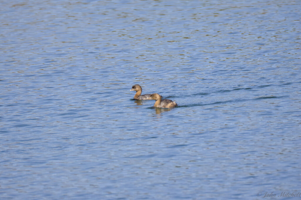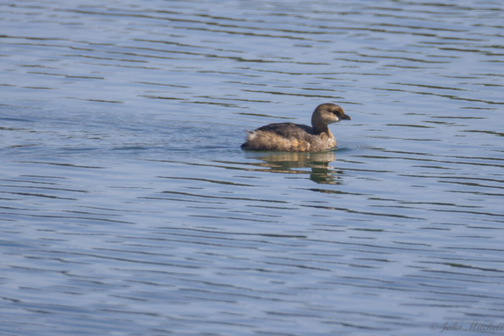 It was sunny again after the bust of a day turtle hunting while overcast. We walked out to the dam, and the water fowl were out again. We got a decent look at them through the scope and camera, so we are pretty sure that these are Pie-billed Grebe. We did get a better picture of them than the first time we saw them. There were three of them that all looked similar. The males and females look very similar, but the males have a slightly thicker bill and are slightly larger.