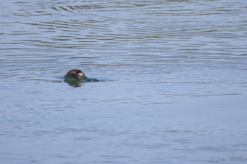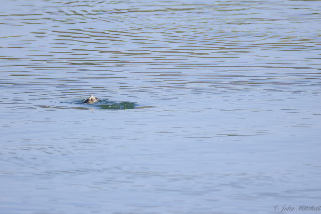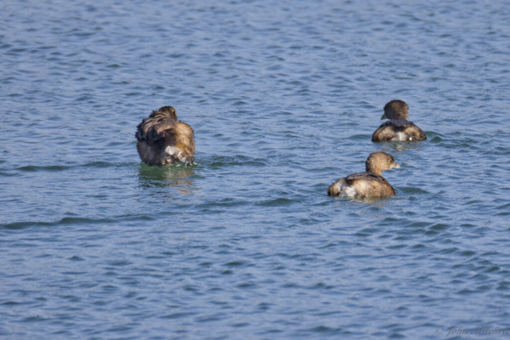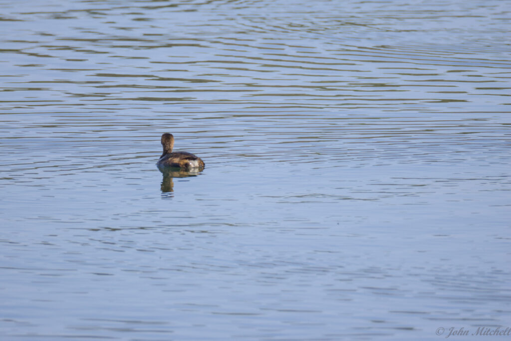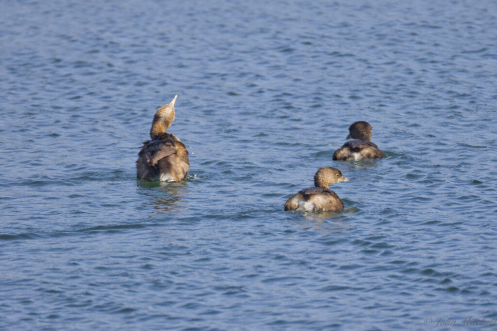 It was sunny again after the bust of a day turtle hunting while overcast. We walked out to the dam, and the water fowl were out again. We got a decent look at them through the scope and camera, so we are pretty sure that these are Pie-billed Grebe. We did get a better picture of them than the first time we saw them. There were three of them that all looked similar. The males and females look very similar, but the males have a slightly thicker bill and are slightly larger.