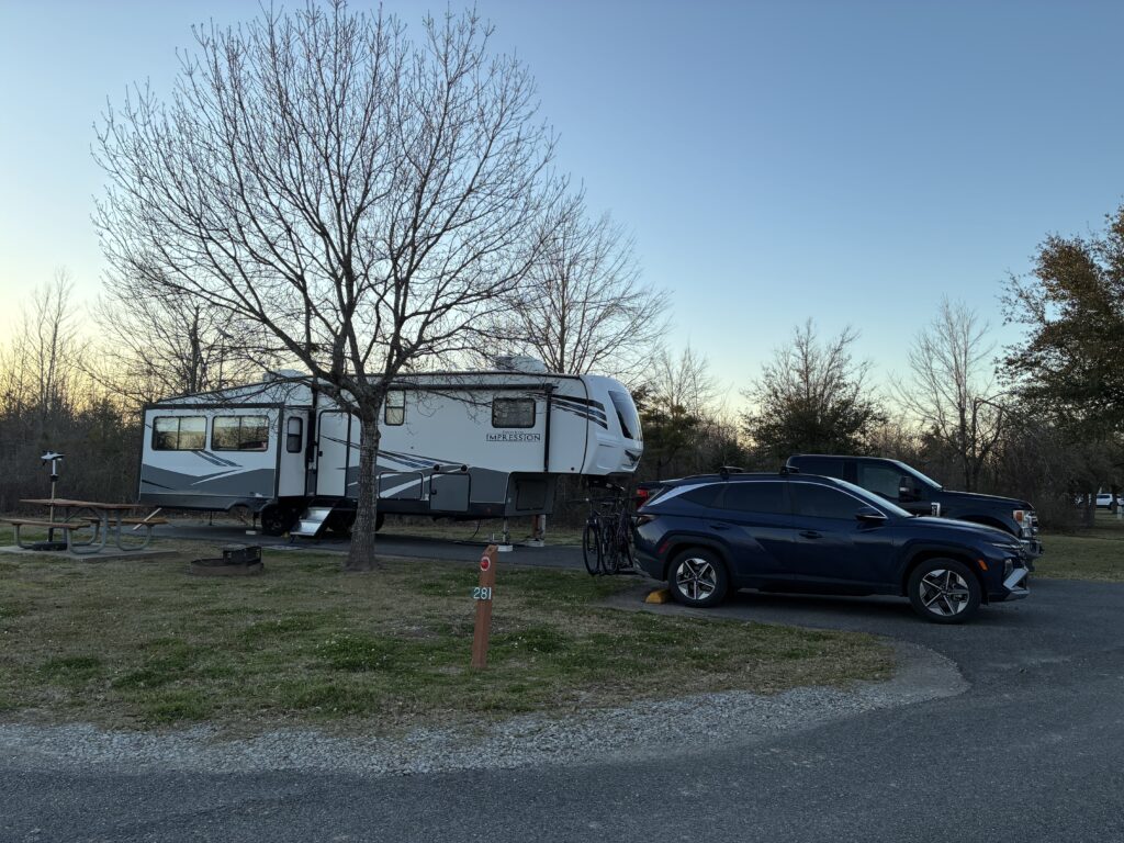 For some reason, the 236 mile drive from Tyler State Park to Poverty Point took longer than normal. I could have been that we left later due to the extra time needed to safely move the trailer out of the Tayler SP site which was a pull through with hazards all around it. We had to back out of the site and carefully maneuver the truck to a good location to hitch up the trailer. It could have been the bad roads along the way.