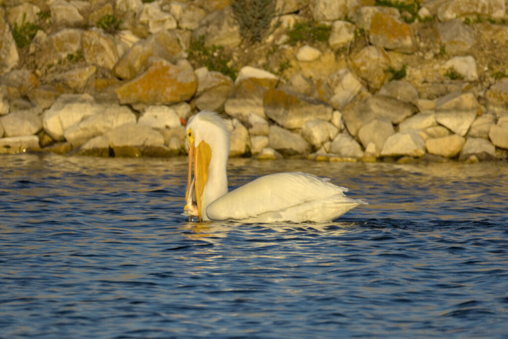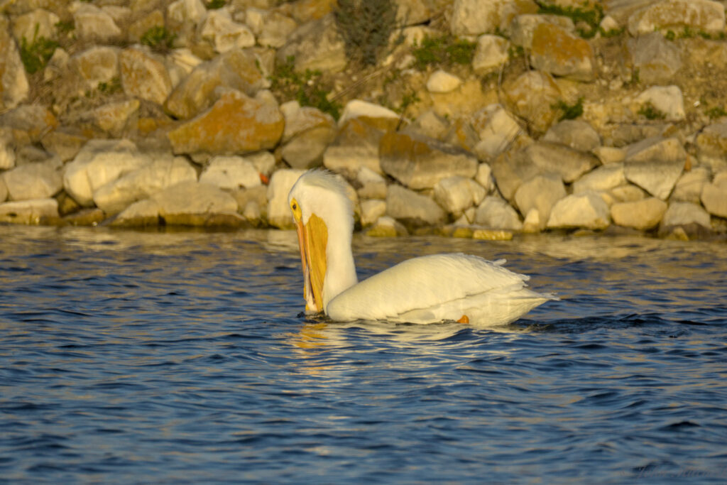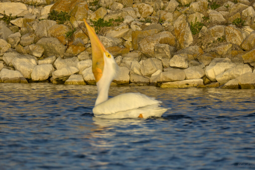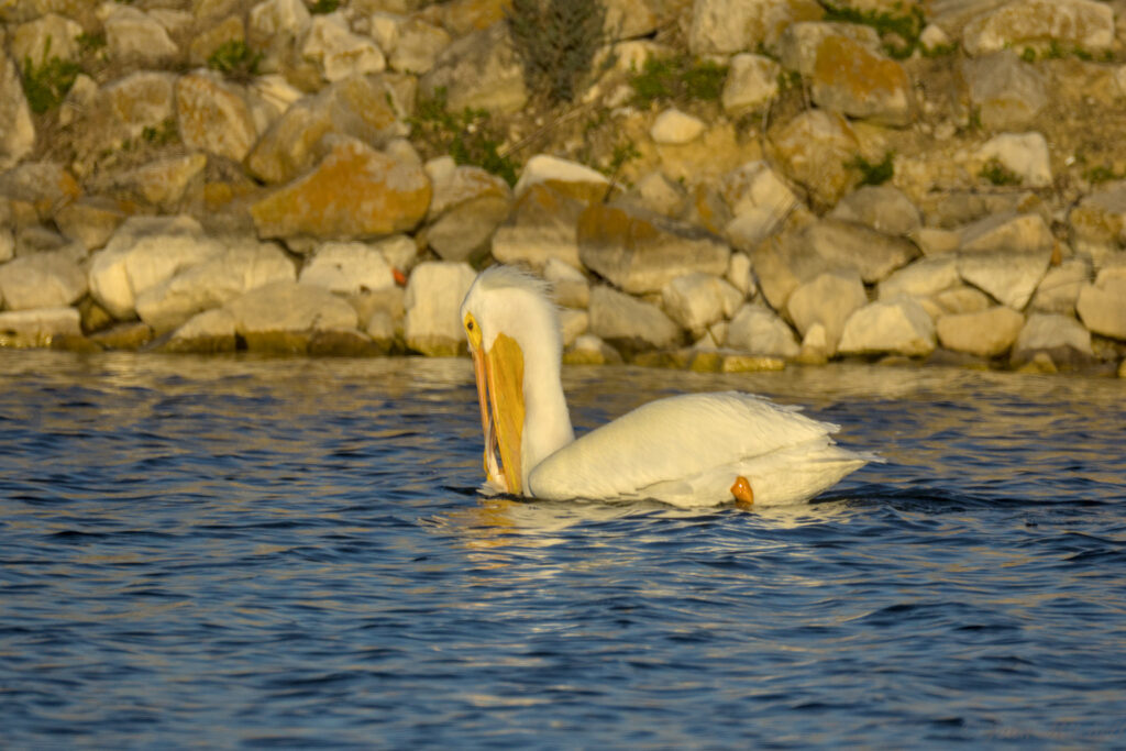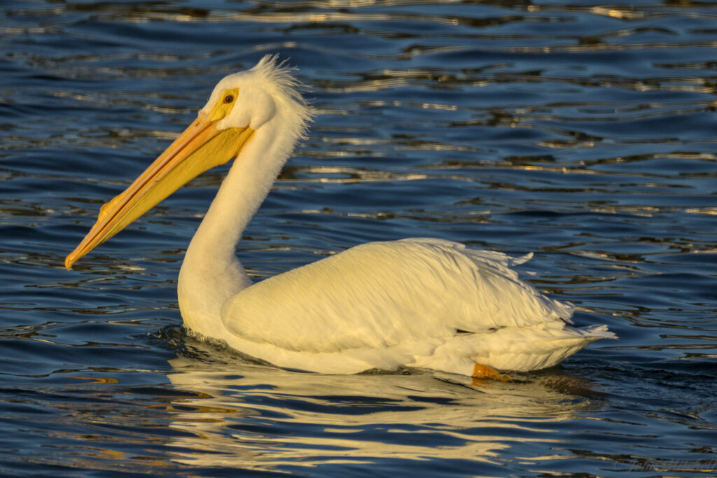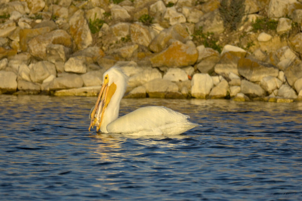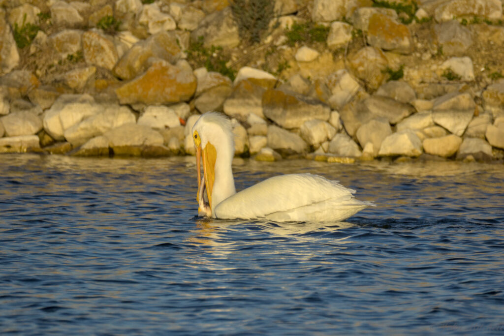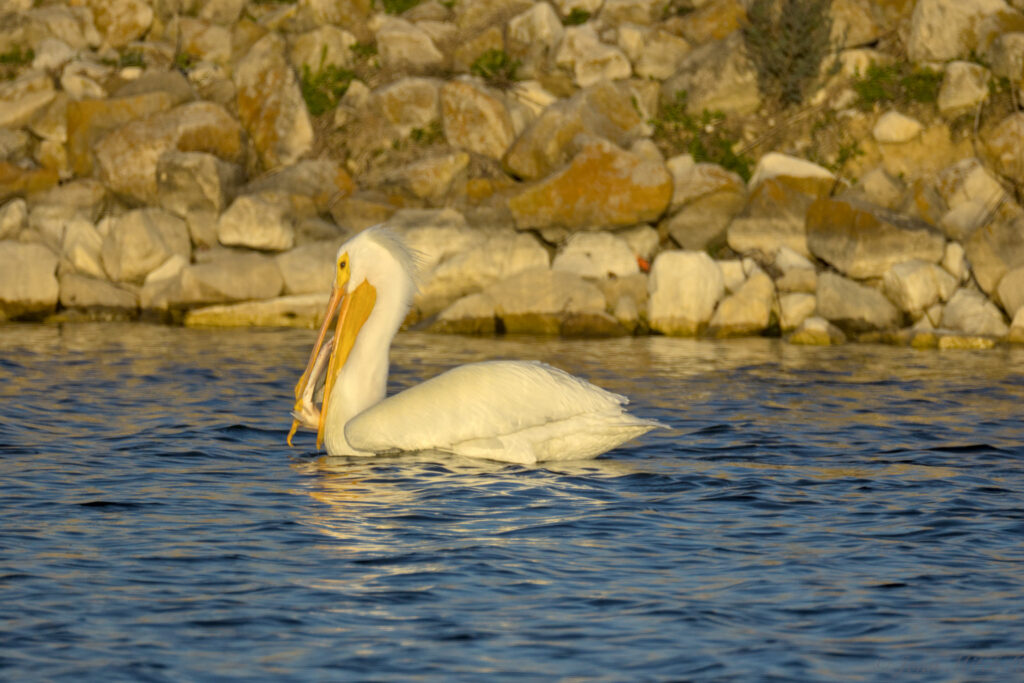 We went to the marina, and all the wondrous things were gone. John thinks she just made it all up, but there were plenty of mundane things to see. John photographed an American Pelican catching and eating a fish. (Warning: If you zoom in, you might see fish guts.) Sadly, the focus shifted to the background for the fish swallow. The yellow tinting is due to the sunset – the Golden Hour.