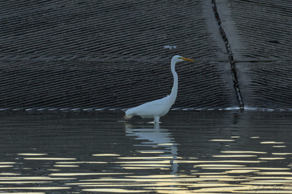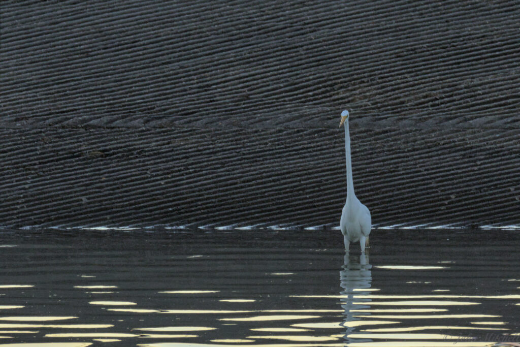 On the way out, we saw a Great White Egret fishing at the boat ramp. (The stripes are the traction grooves in the boat ramp.)