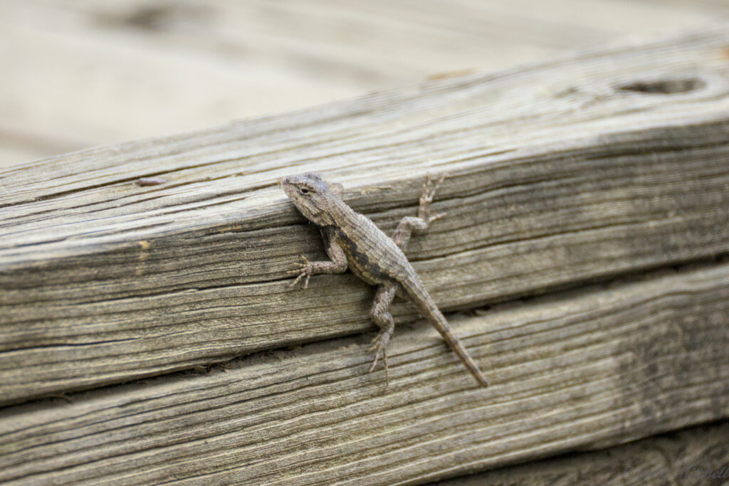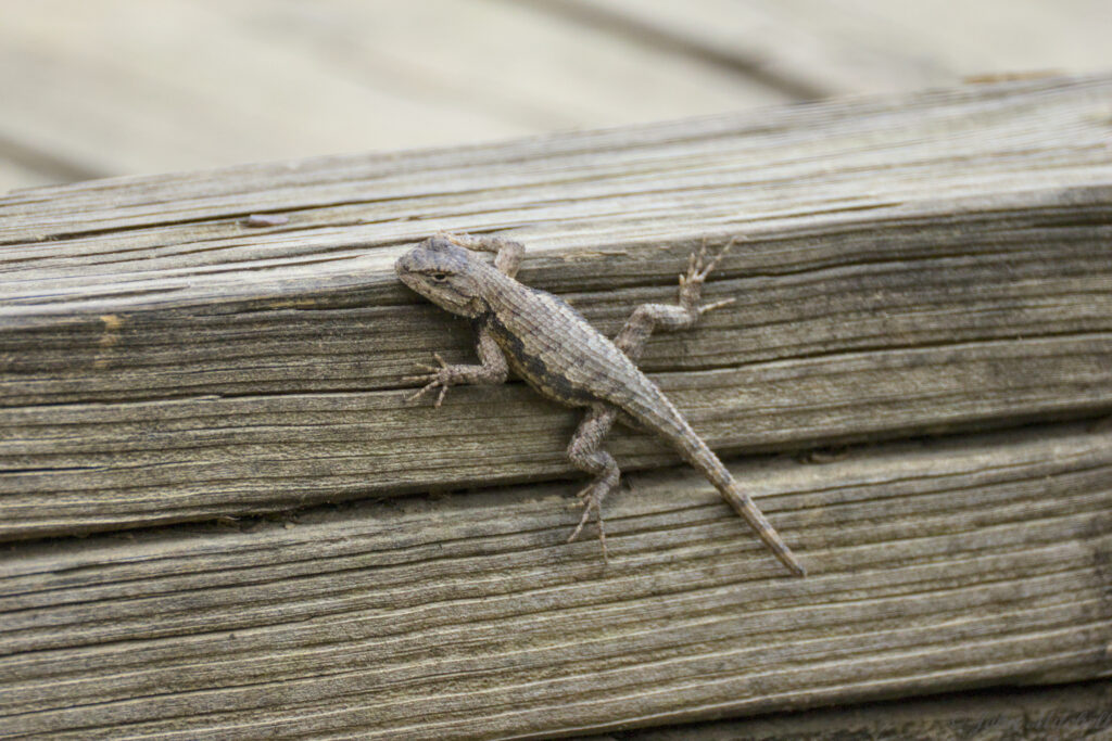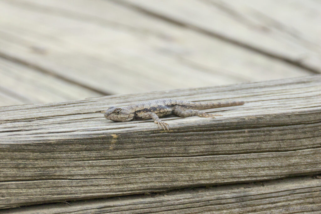 Another day, we saw a lizard at the interpretive pond. It was very tolerant of being photographed. Our best guess is that his is an Eastern Fence Lizard that lost the tip of its tail.