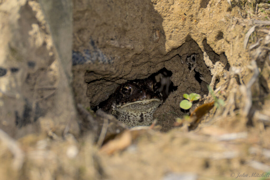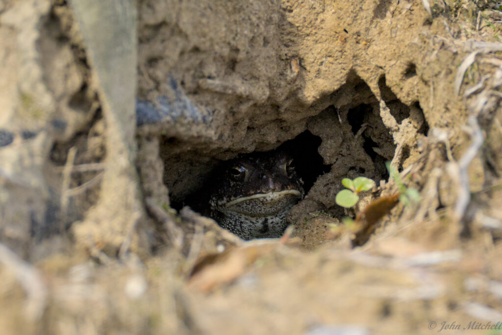 After putting MacKie back inside, John went looking for him. While getting the camera, the lizard left, but John found a toad hole instead.