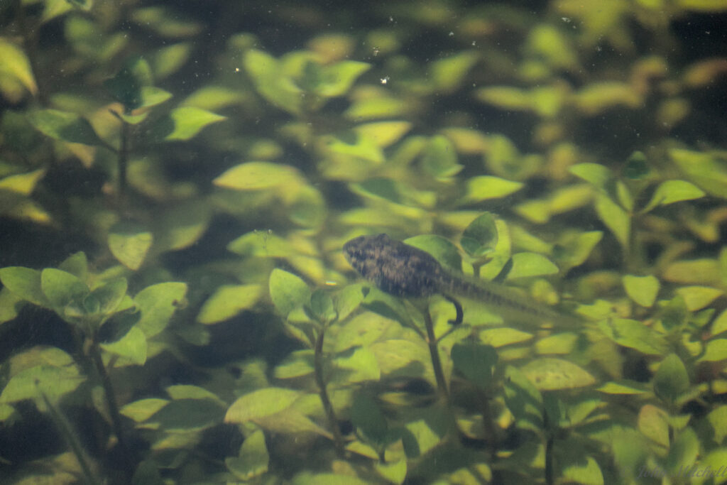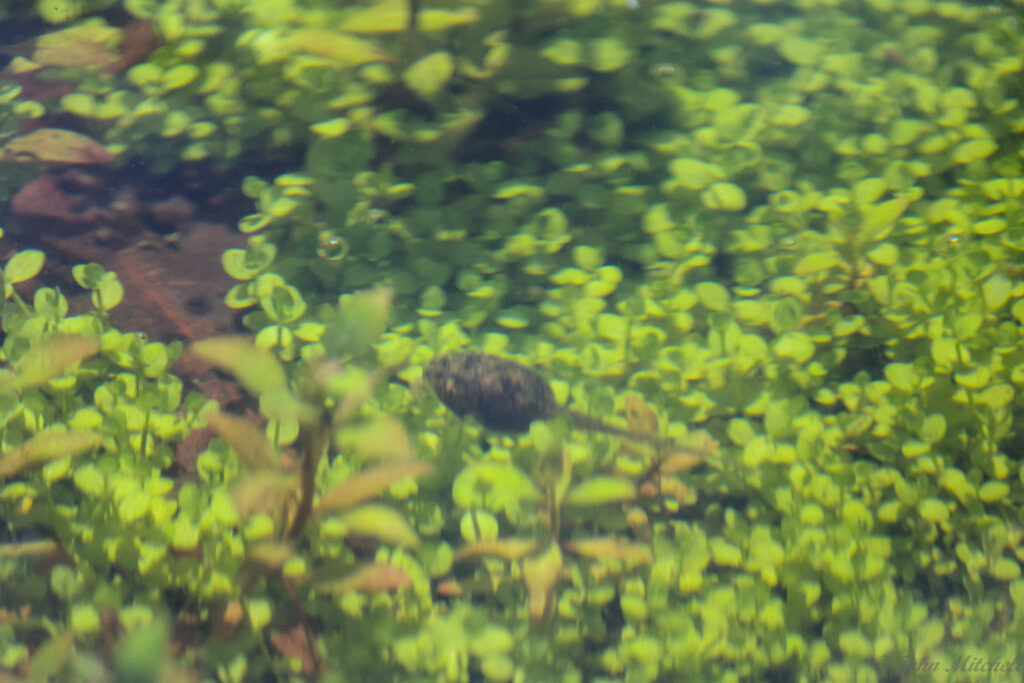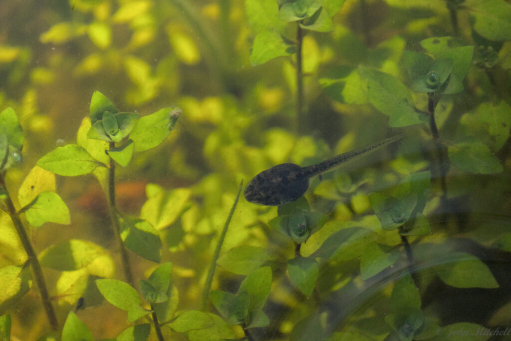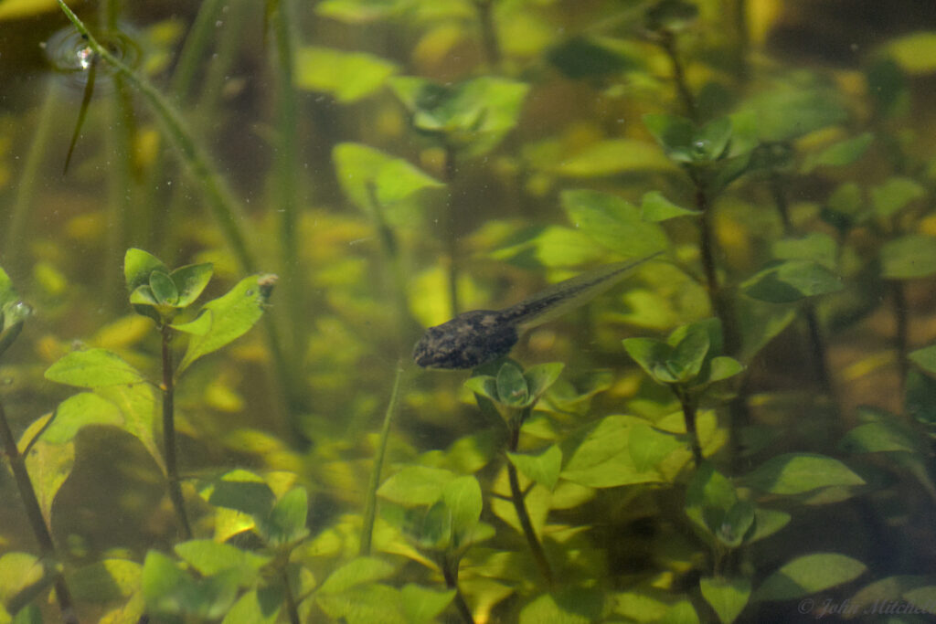 We have been hearing frogs croaking loudly at night, and there is a drainage hole with about a foot of water in it. After close inspection (and some patience), it turns out to have tadpoles.