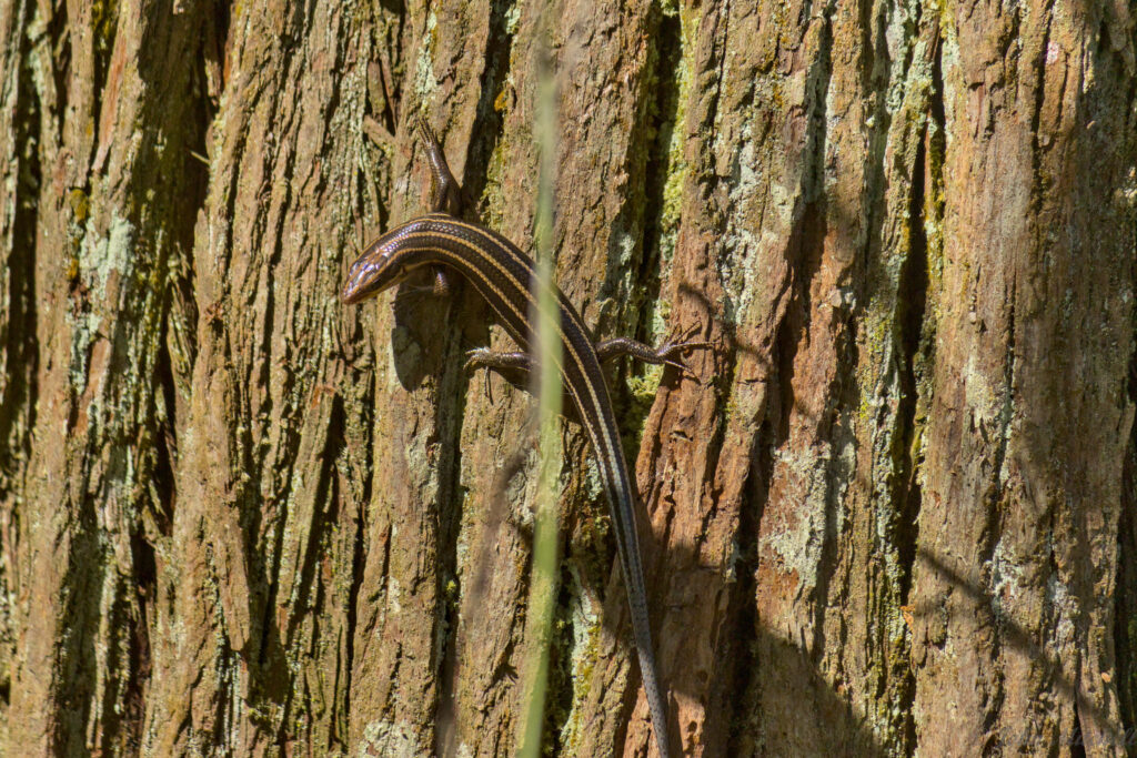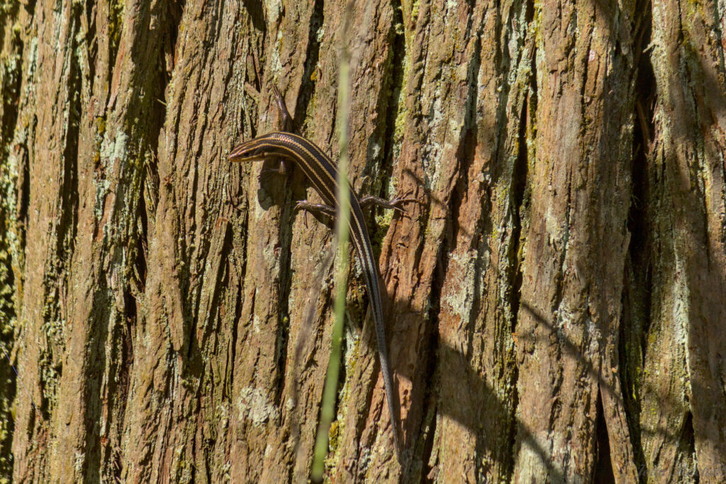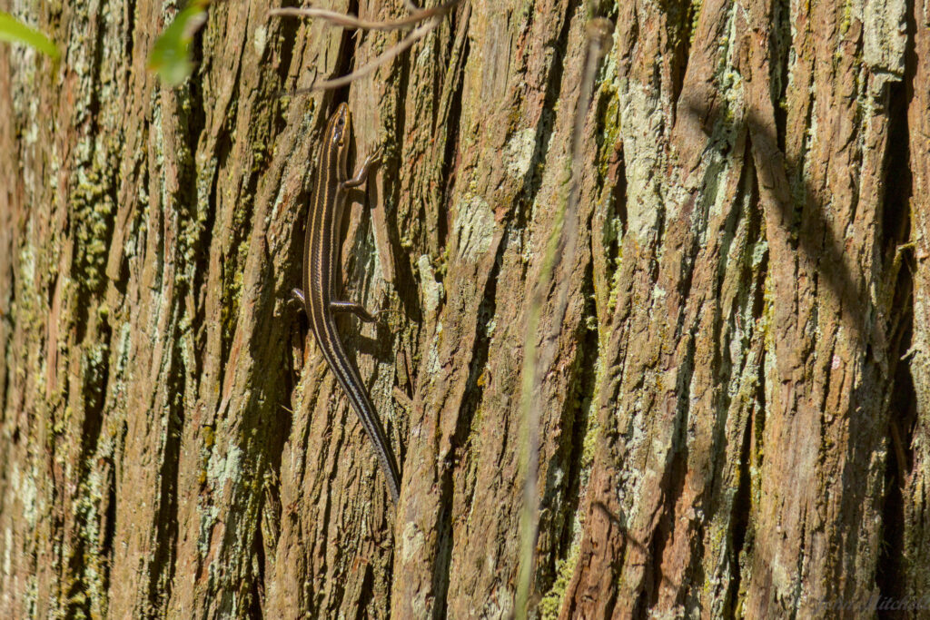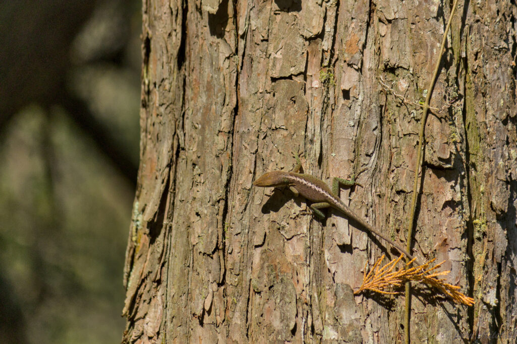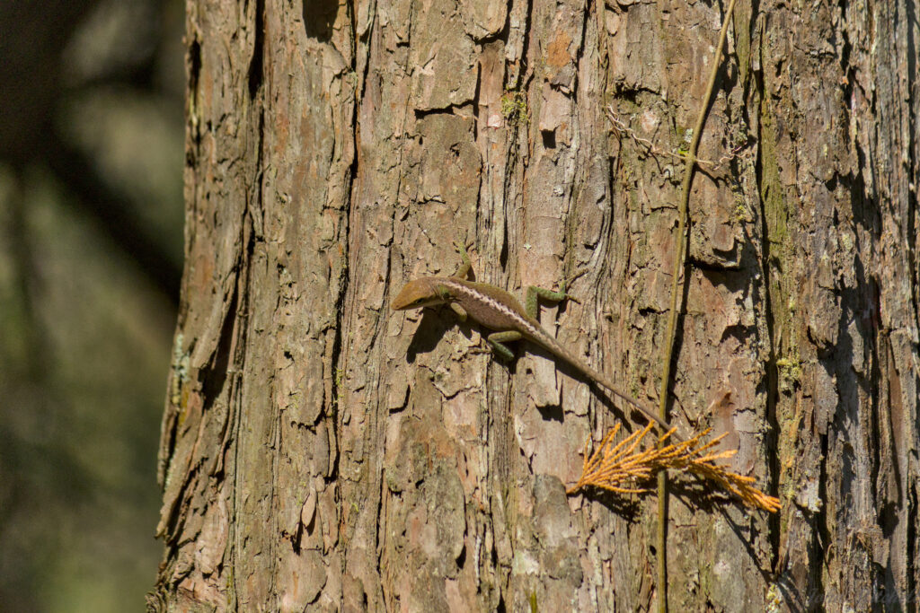 While John was photographing the flower and snake, Kate found some reptiles. One looks like a juvenile or female Green Anole.