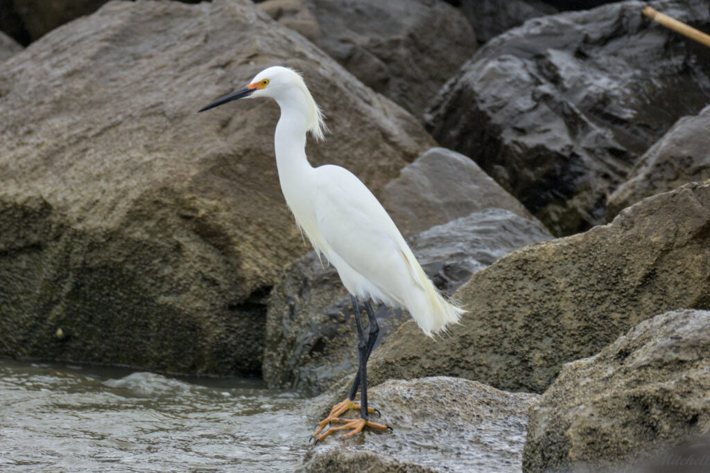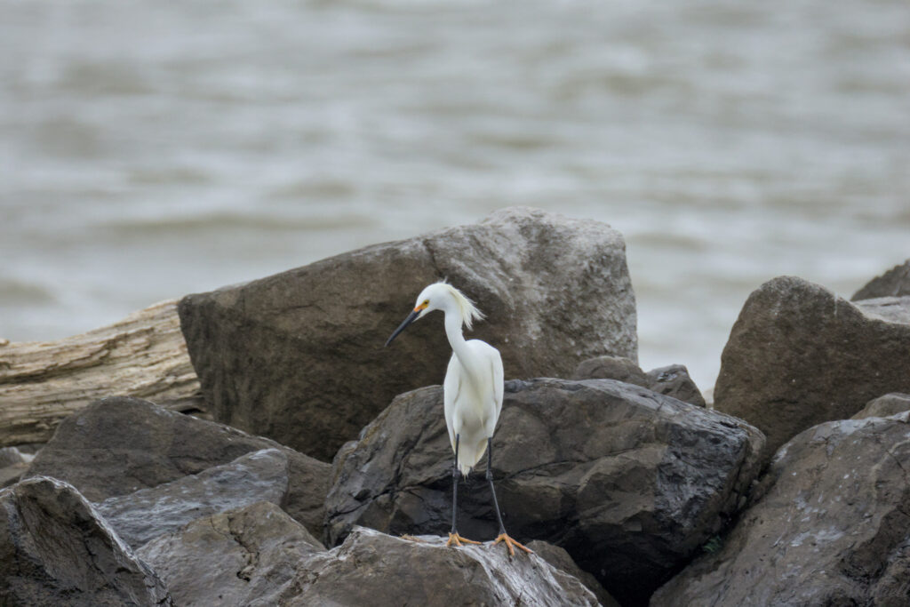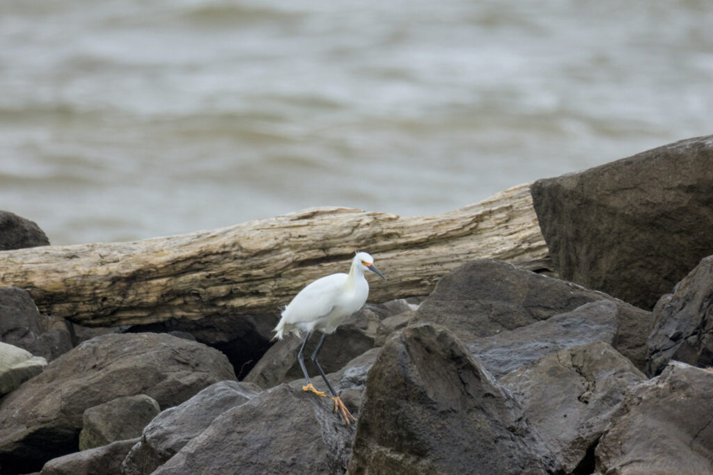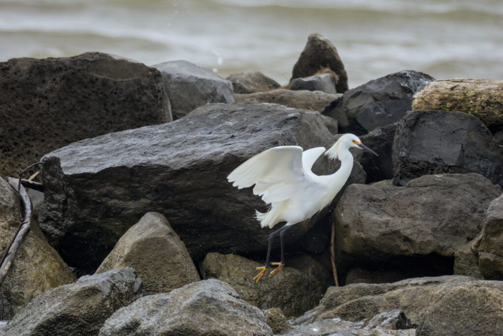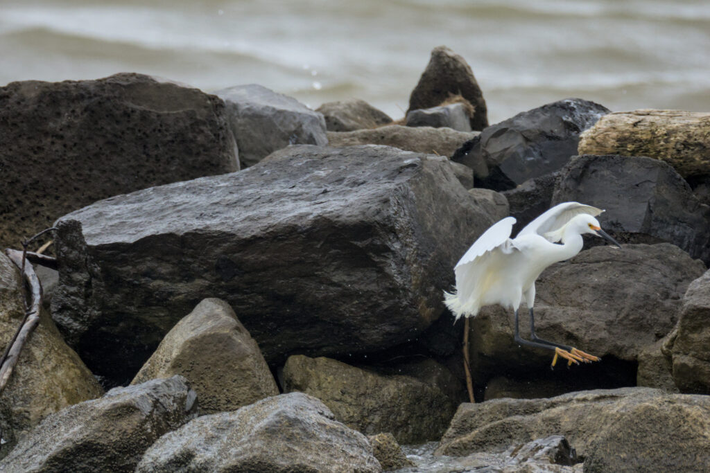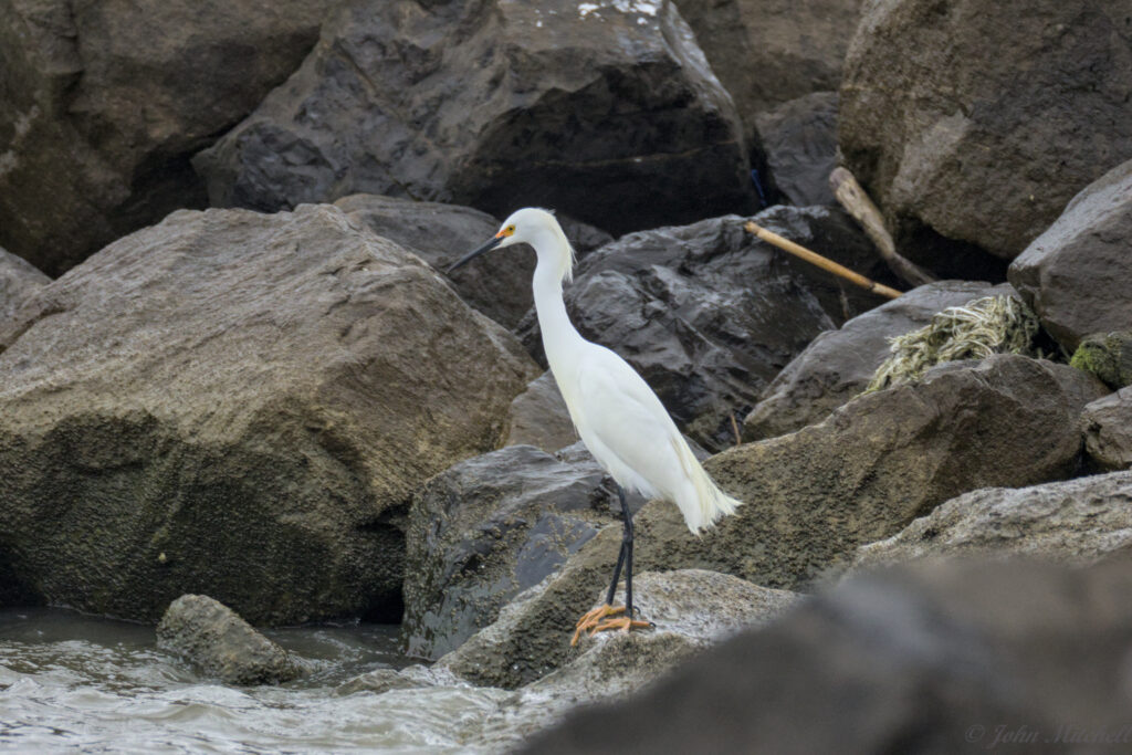 The first Snowy Egret did a fair amount of hoping from rock to rock. A few times, it got in a little too deep and the waves tossed it around. There is a video of this on the exploration post.