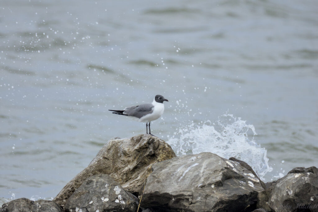 The first pelican on the rock was joined by another, and they swapped between sitting on the rocks and fishing. The Laughing Gulls were flying around and sharing the rocks with the Brown Pelicans.