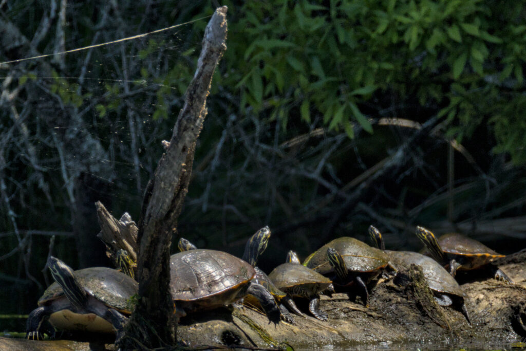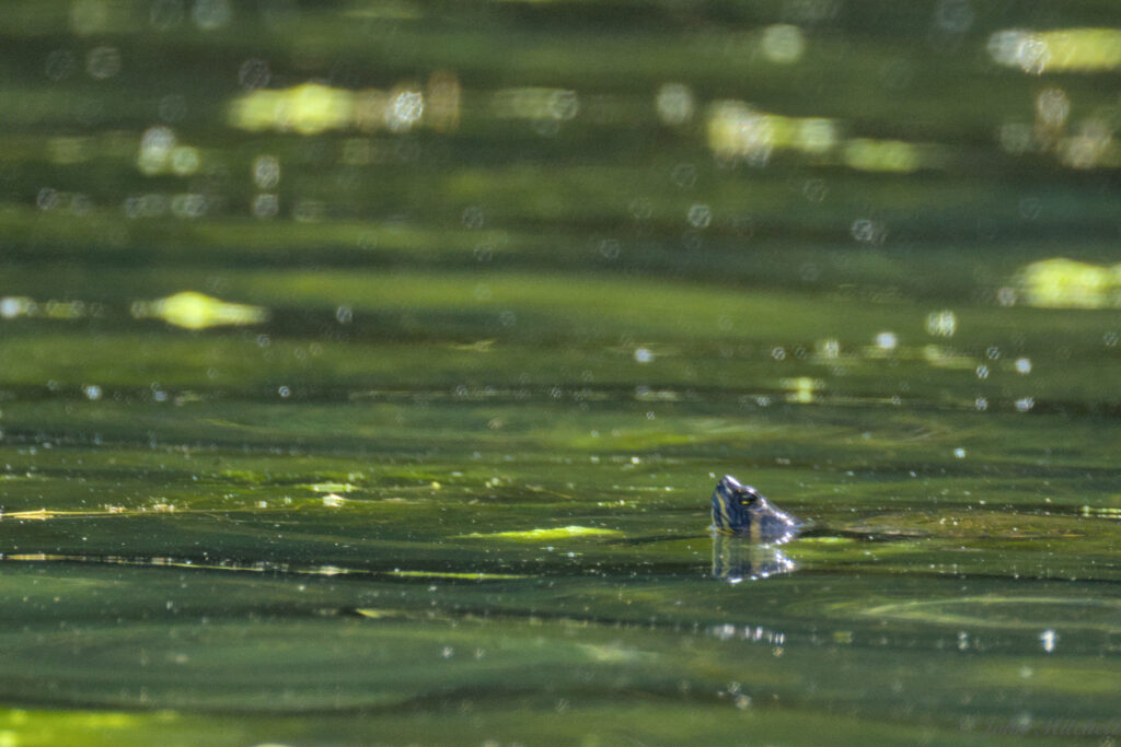At that, we saw a mix of turtles; some have the yellow “S” of the Yellow-bellied Sliders and some do not. We are not sure what they all are.