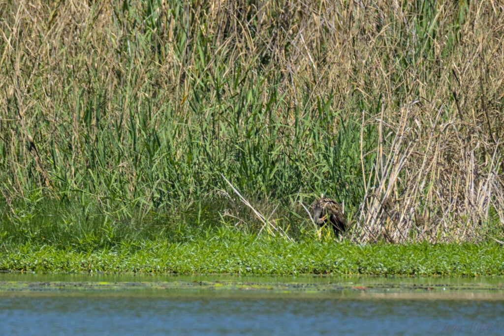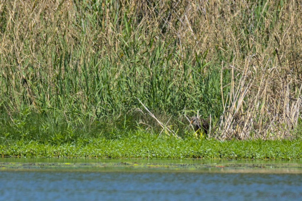 We saw a brown “Heron” or “Egret” fly in to land in the grasses. We thought it might be a Yellow-crowned Heron, but Kate searched and identified it as a Limpkin. Either one would have been a new bird, but this one is kind of unique. It is adapted for eating Apple Snails. Sadly, it was far away, the dock kept rocking, and there was heat shimmer, so the pictures are not great.