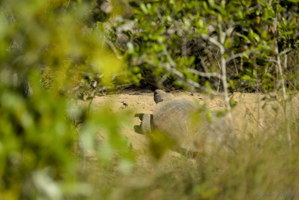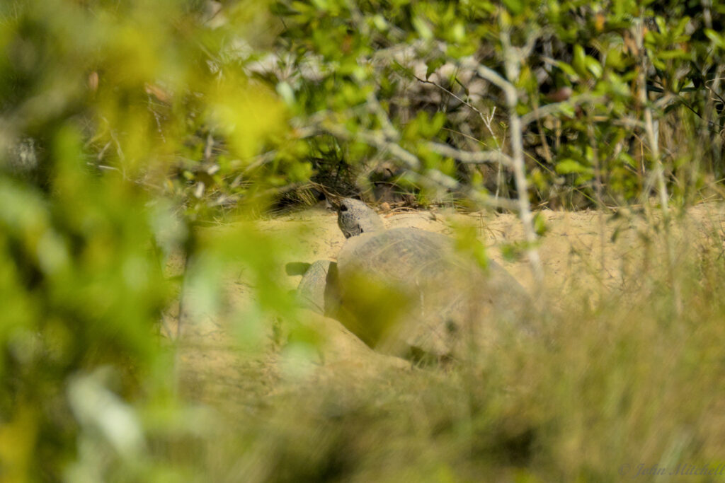Given the ruckus on the road, John decided to try to Gopher Turtle Trail. After seeing a bunch of nothing and hearing from the hikers going the other way that there was nothing, he saw a turtle. It looked like it as sitting on a burrow. It was distant and partly blocked by leaves.