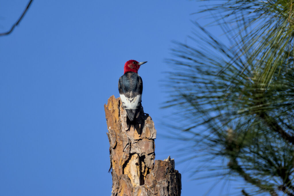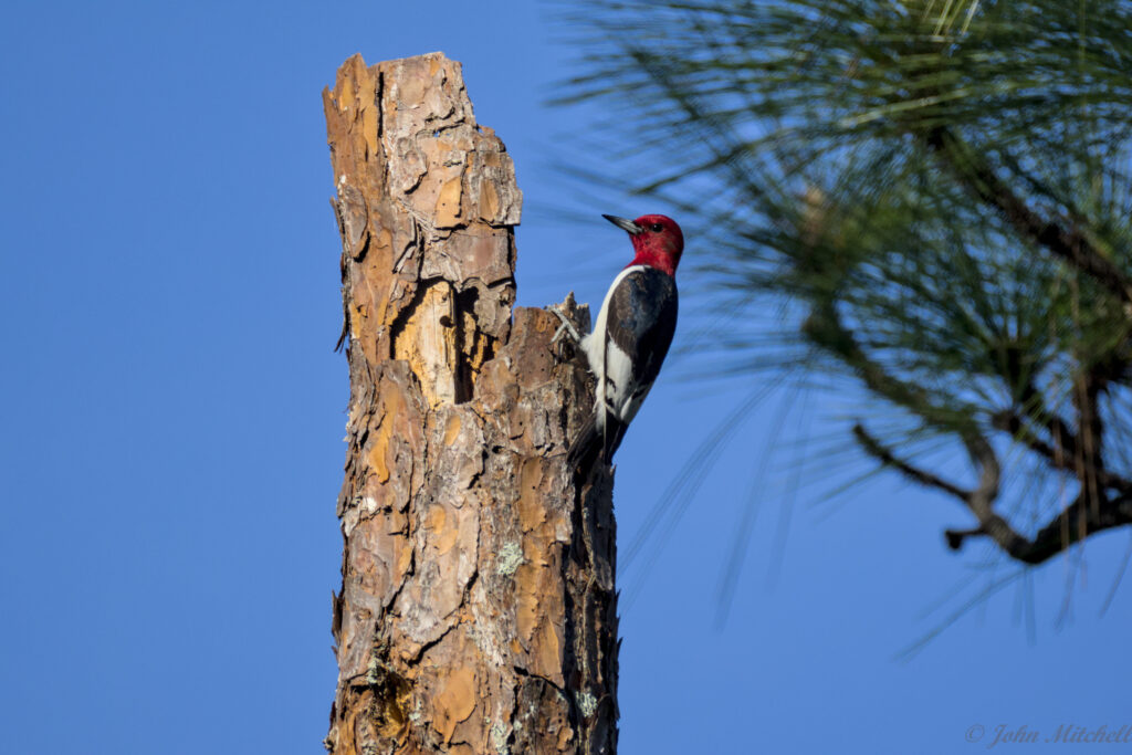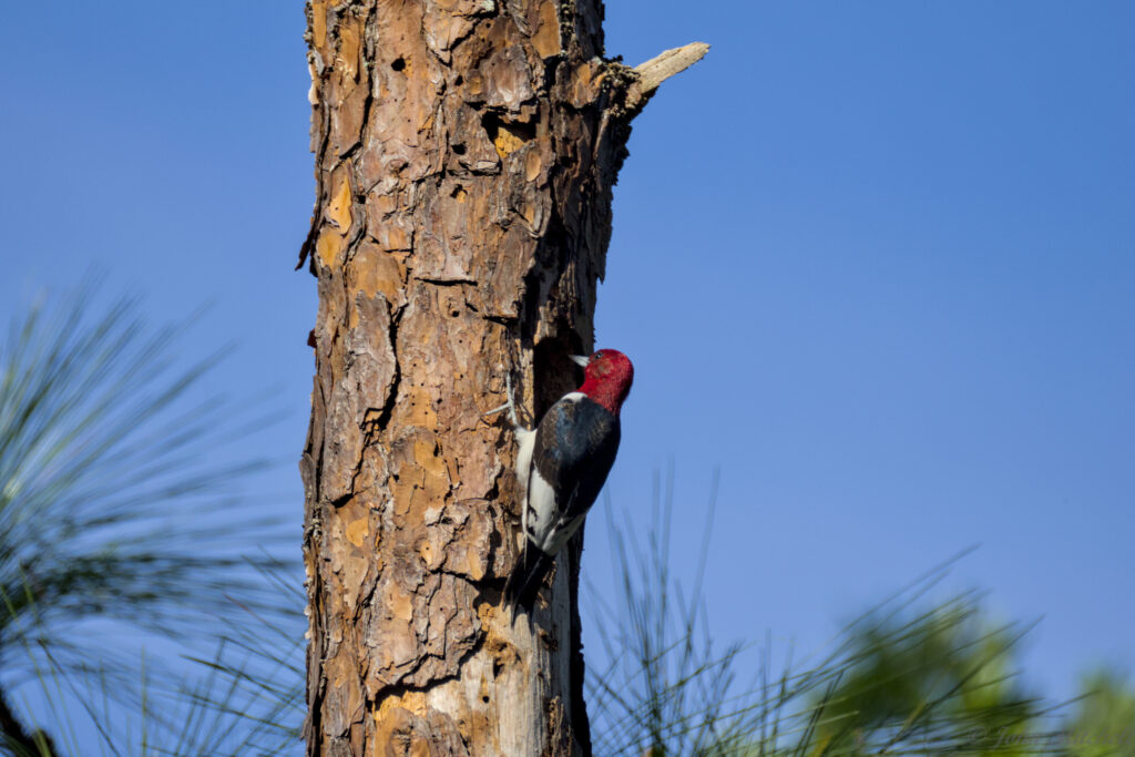 He called Kate, but her phone appeared to be muted. On the way to get her, he saw a Red-headed Woodpecker land on a broken pine not far ahead. Usually, we cannot get very close to wood peckers. We think this one might be a yearling. Some of the feathers on the head are brownish and there are still residual stripes on the wings.