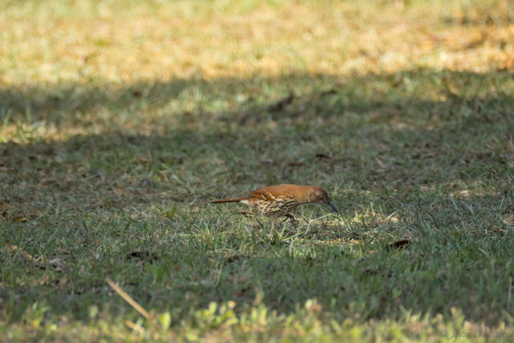 John brought Kate back to the Gopher Tortoise, but it had left. Kate went back to work, and John walked down to the lake to check for the Swallow-tailed Kite. On the way, he saw a Brown Thrasher, but it moved to much for good pictures. These birds are constantly hopping around thrashing the grass and leaves with their beaks to find food.