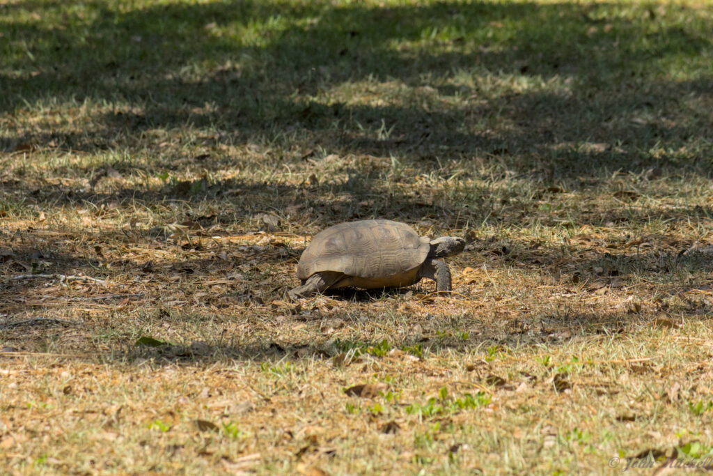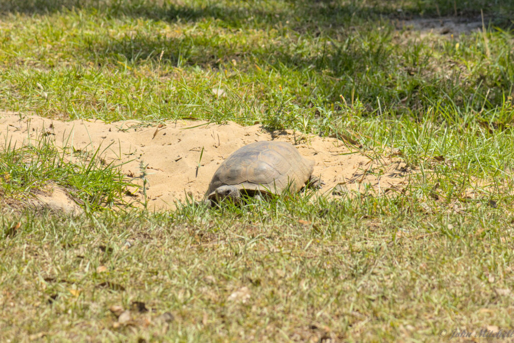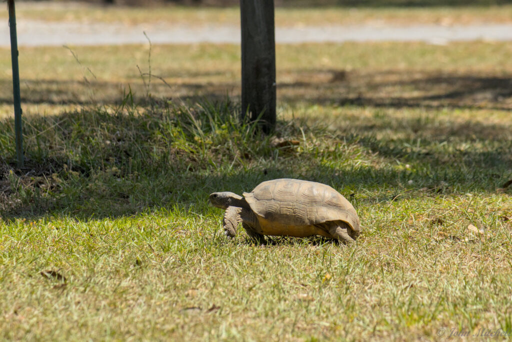 Shortly after John got back, Kate left for the park office, and she saw the local campground Gopher Tortoise. Kate said that it charged at her, when she got to close. When John got there, it was running for its life from Kate. (John wonders if she used her bear spray on it.)