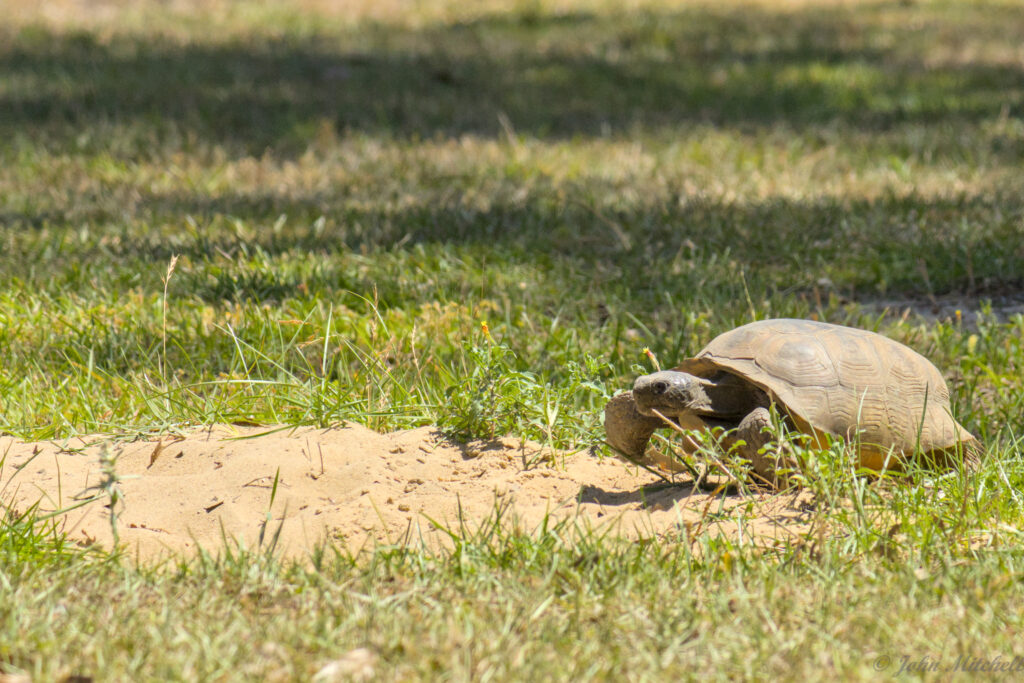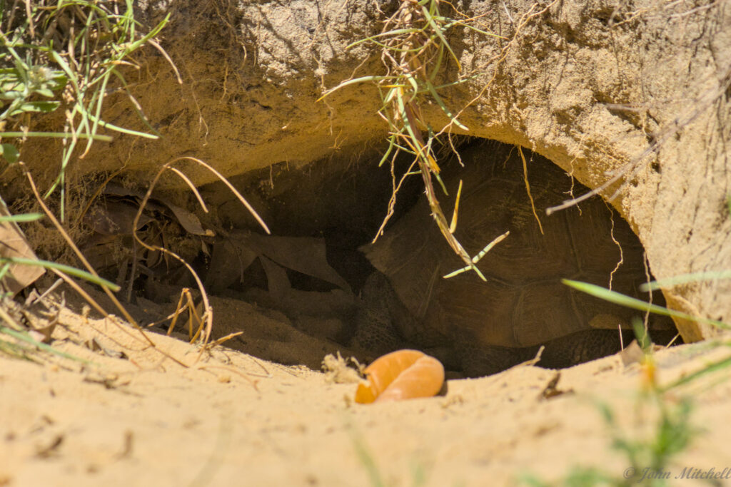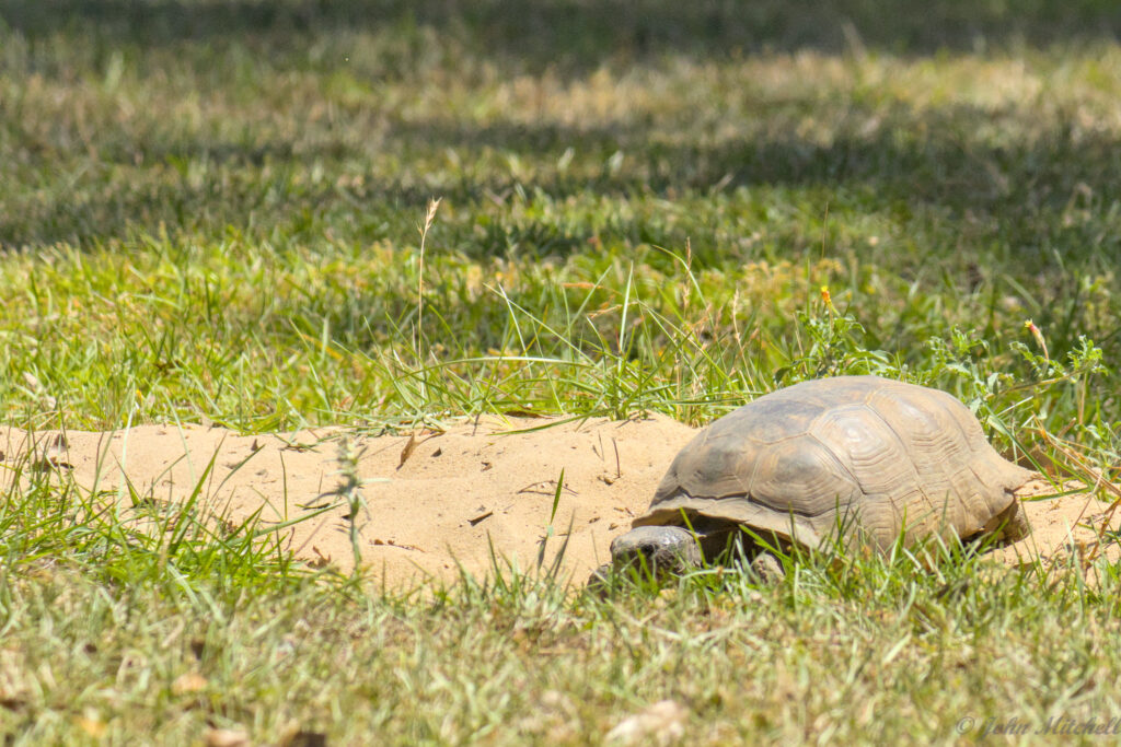 The Gopher Tortoise is the Georgia State Turtle (designated in 1989). It is protected in the state of Georgia, but it is not federally listed as an endangered species. It is in the initial stages of “Threatened” (specially, “Vulnerable”) due to habitat fragmentation. It is an important species for the local environment because the burrows provide shelter for about 300 other species.