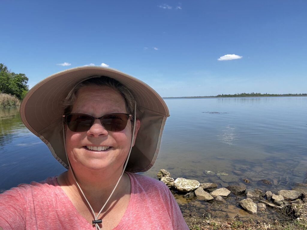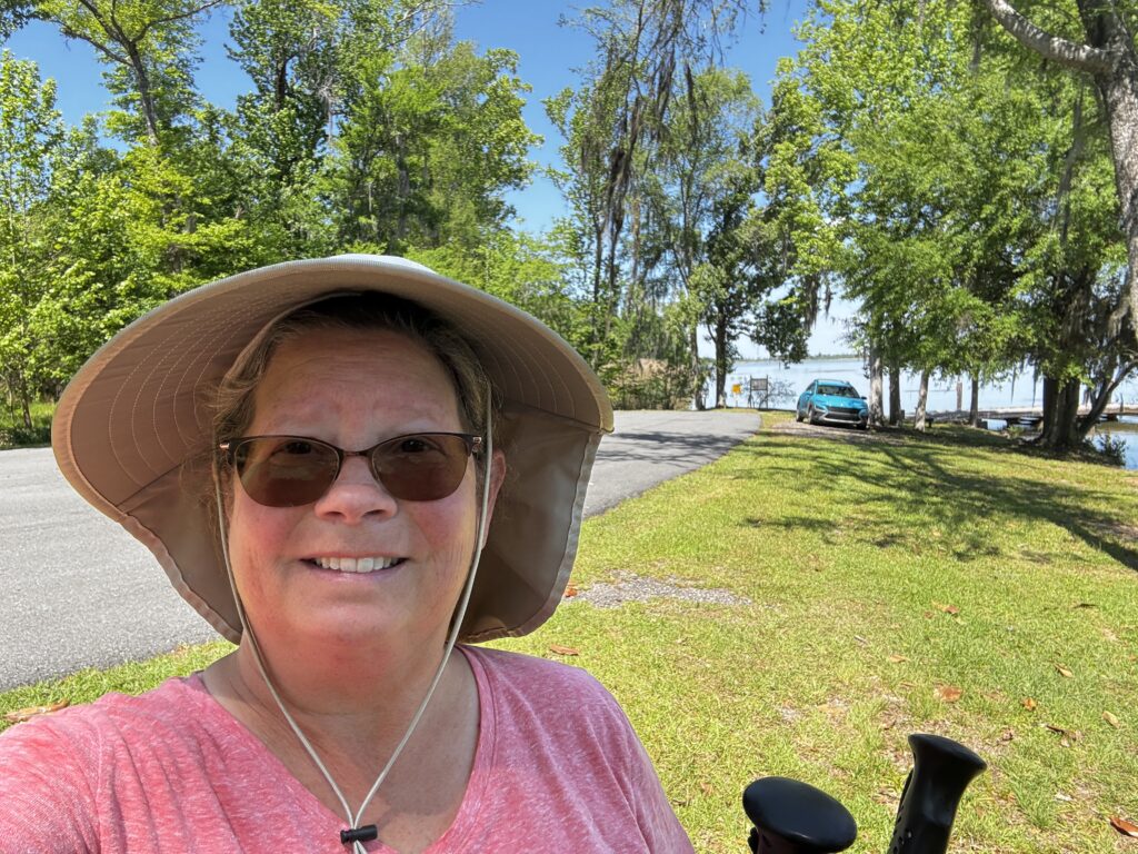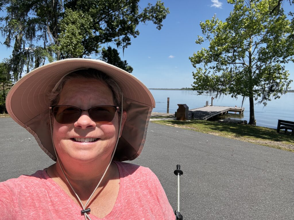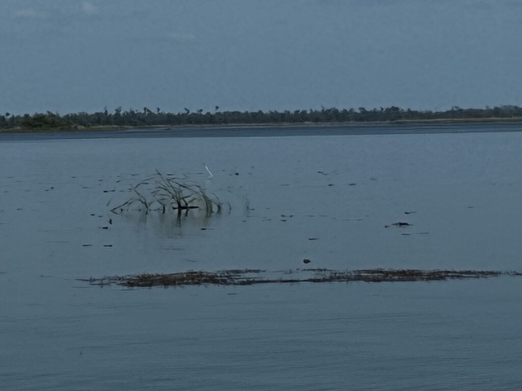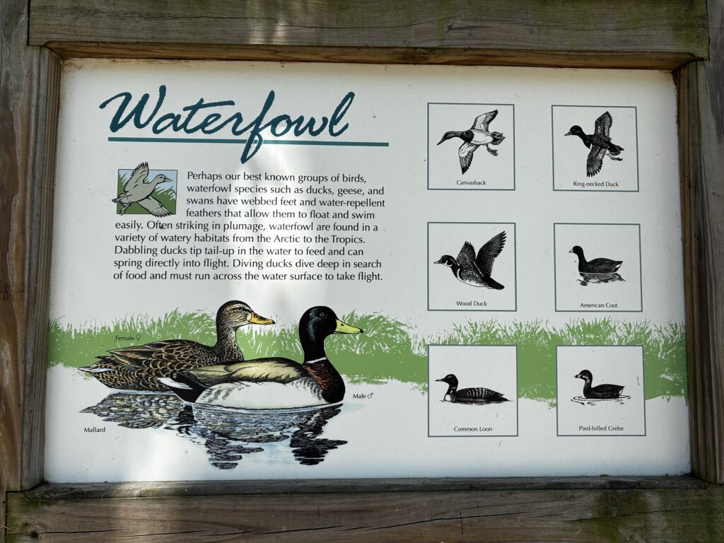 When we were at the water, we did see a gator off in the distance. Though, I don’t think you can find it in the picture. My hope was proof that we saw a Florida gator. We were able to take a better gator picture at Howell’s Landing. The lake also had an information board on the types of water birds we could see. I noticed the wood duck was on the board and no wood duck was present. It is still on our must see list 🙂