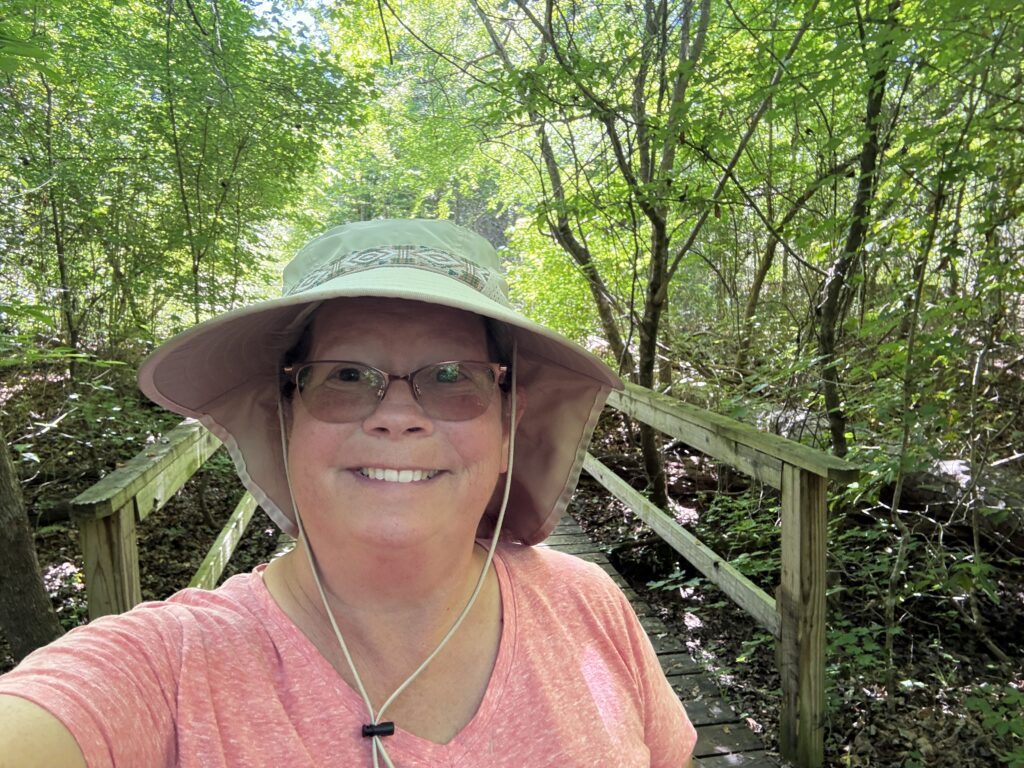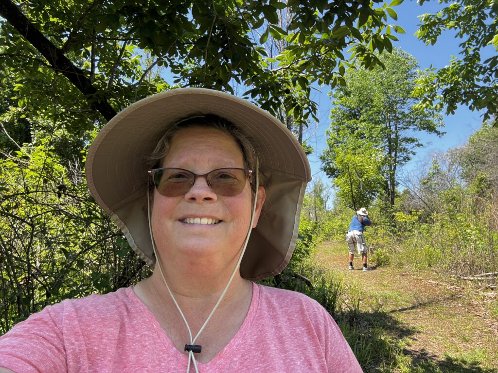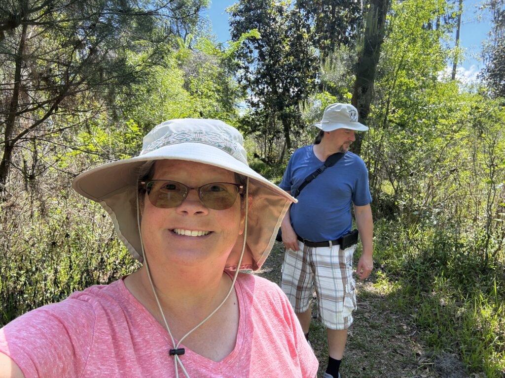 The trail was just outside our trailer. I didn’t take a selfie just before the trail, but did as we entered. As you can see, John had already found an interesting critter to take a picture of.