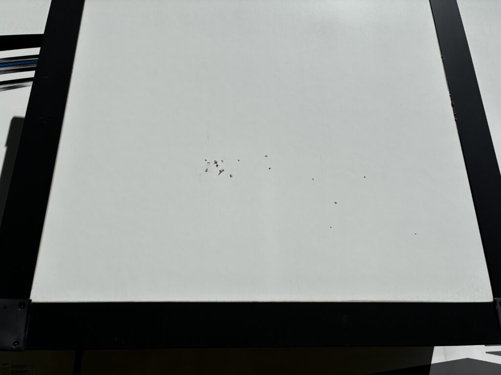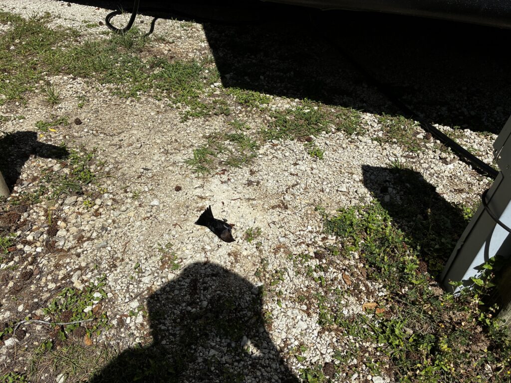 When we left the trailer, I was surprised to see a dead bird next to our power station. After looking around, I found feather splatted on our bedroom slide. The dead bird made me think of Dad’s house. Dad keeps the front bay window open to watch the birds. The wall across from the window has a large mirror. So, the birds see themselves and fly into the mirror. This doesn’t always result in death. Sometimes the birds just knock themselves silly.